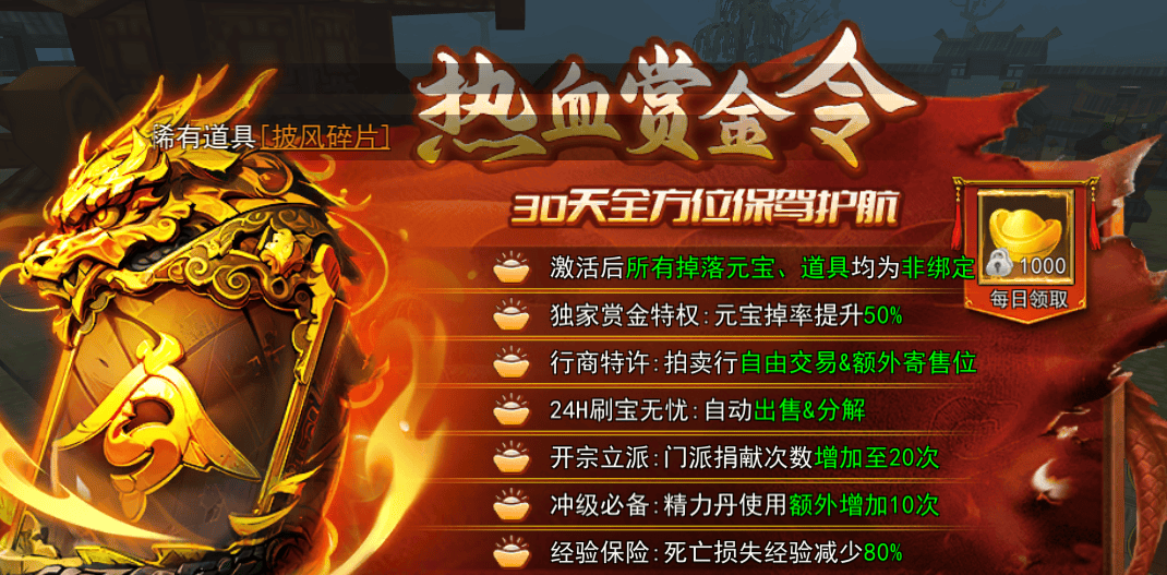 赏金令:开放交易权限,提升金元宝掉落率,每日可领1000绑元。