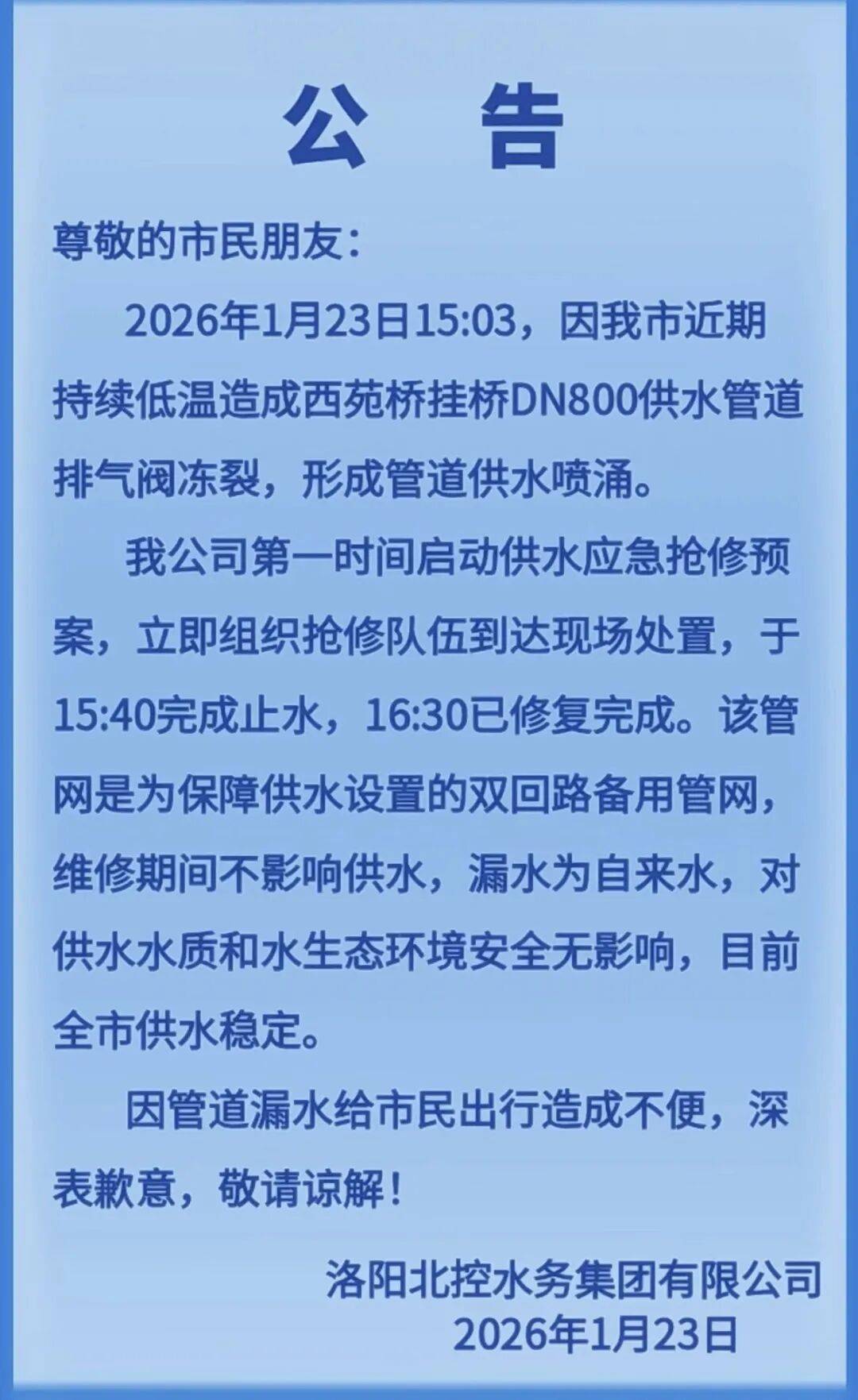 关于西苑桥供水管道突发漏水的公告
