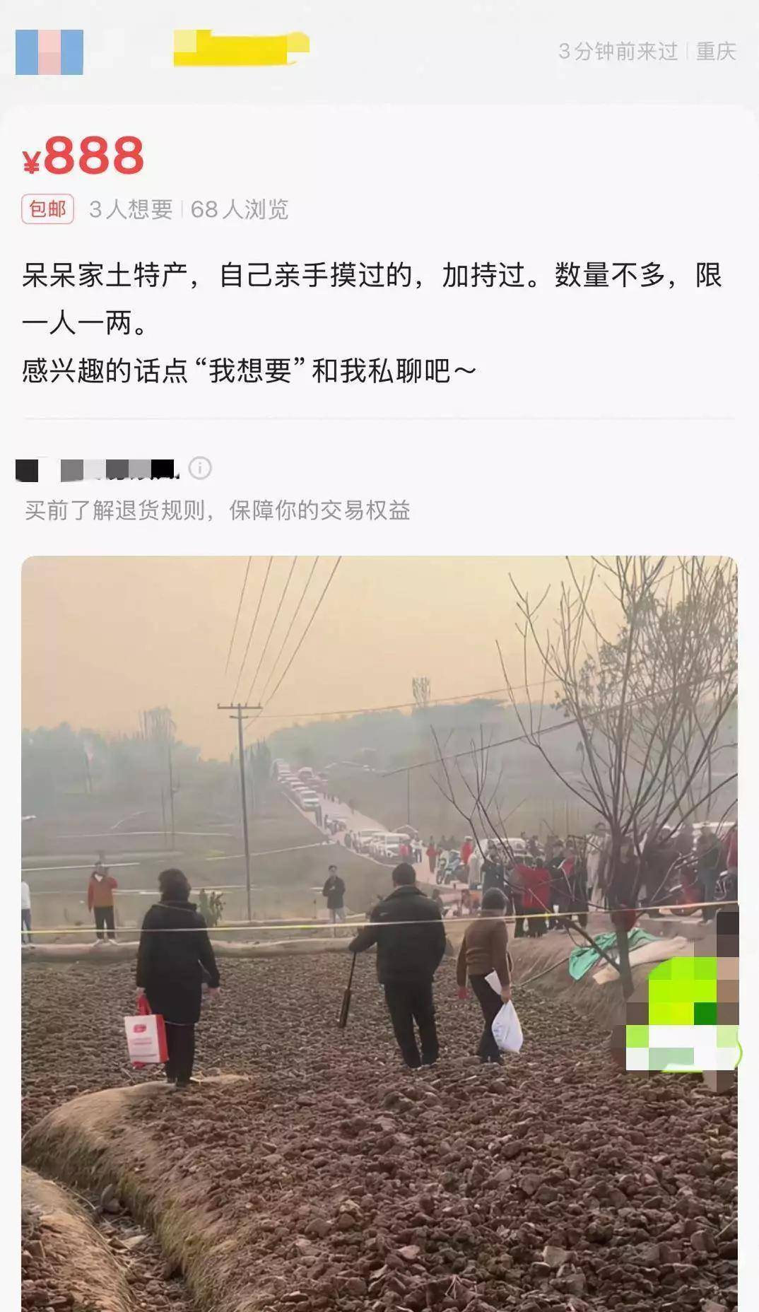 在社交平台上,不少当地网友发布的视频显示,有人手持锄头在呆呆家门口挖土,也有人提着袋子装土。相关截图显示,这些“呆呆家的土”售价不一,例如“66.66元5斤”“128元一坨”等。卖家还打出噱头,称其为“转运土”“风水宝地富贵土”,宣称“适合种花种菜,量大可物流”。