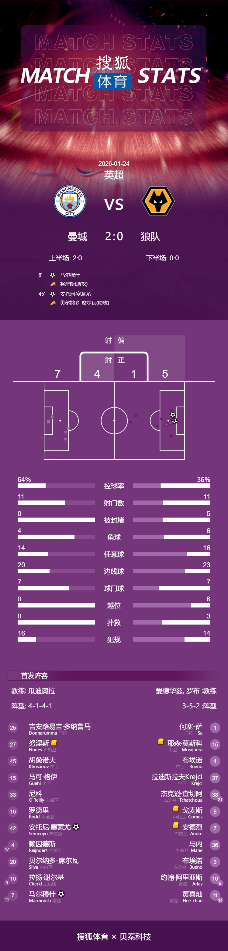 北京时间1月24日23点,2025-2026赛季英超联赛第23轮迎来了一场焦点之战,曼城坐镇主场对阵狼队。上半场,努内斯传中,马尔穆什抢点破门。B席传球,塞梅尼奥连停带过,随后射门扩大领先优势。下半场,塞梅尼奥射门击中门框弹出。最终,曼城主场2-0击败狼队,终结了自身各项赛事两连败,同时在先赛的情况下暂时将和榜首阿森纳的积分差距缩小到4分。