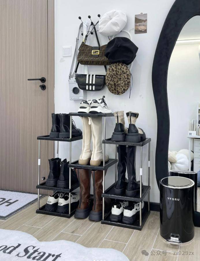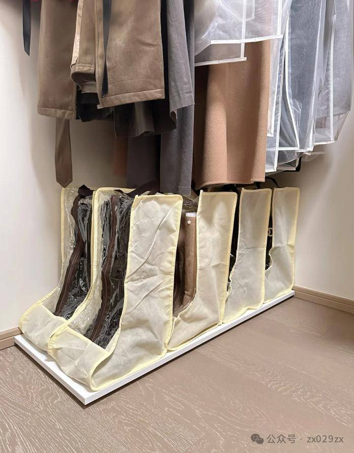 网友@养生大王:鞋柜压根没有多余空间留给高靴,所以每年高靴都是收纳在独立的衣帽间。衣帽间没有做柜子,都是开放挂衣的,DIY一块木板,下方沾上小轮子,采用专用的高靴收纳袋,上方专门收纳高靴,也防尘,还可以保证不变形,实惠简单。