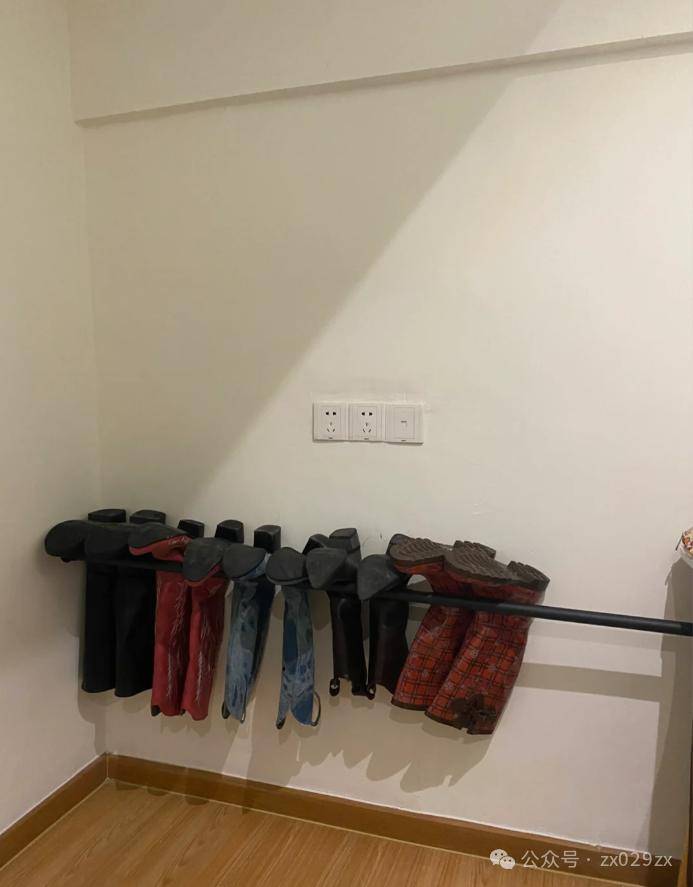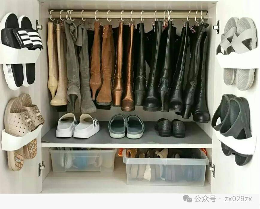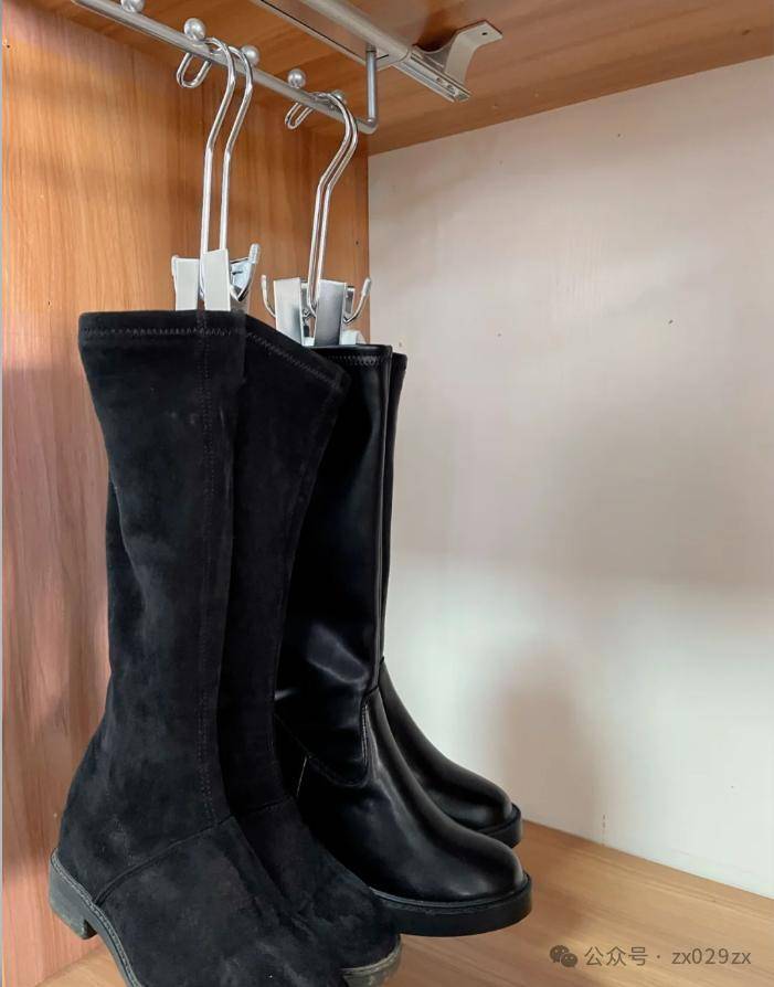 有网友分享了采用鞋柜内部做挂衣杆的形式,然后采用C型挂钩和燕尾夹,专门在冬季收纳高靴,但是有个弊端,夹子的力度太紧的话,会让高靴变形,一定谨慎。
