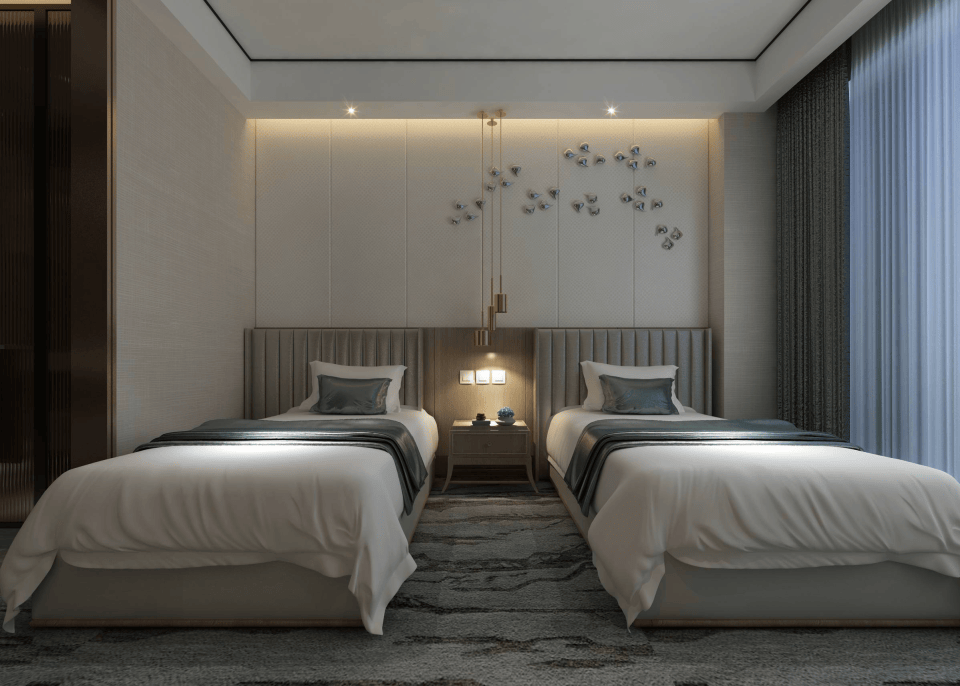 - 人性化细节:床头阅读灯(可调亮度)、客房隔音处理(窗户用双层中空玻璃,门缝加隔音条)、遮光率≥90%的窗帘。