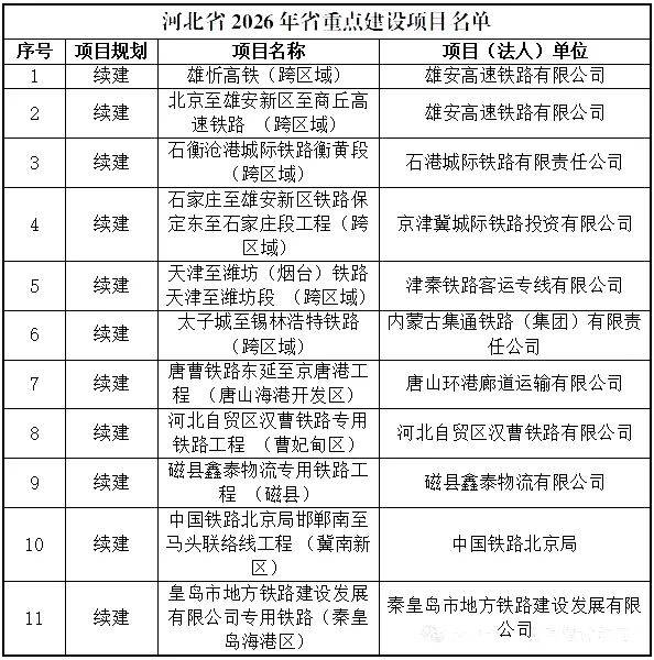 河北省2026年重点建设项目共747项,总投资1.56万亿元,其中铁路项目11项,主要有雄忻高铁、雄商高铁、石衡沧港城际铁路、石雄城际铁路、津维高铁、太锡铁路、唐曹铁路东延至京唐港工程、河北自贸区汉曹铁路专用铁路工程 ( 曹妃甸区)、磁县鑫泰物流专用铁路工程( 磁县)、磁县鑫泰物流专用铁路工程( 磁县)、秦皇岛市地方铁路建设发展有限公司专用铁路( 秦皇岛海港区)等。