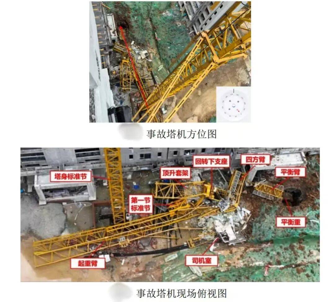 事故直接原因:塔机安拆作业人员顶升拆卸标准节时,仅将顶升横梁右侧销轴少部分放置在标准节踏步中孔内,该销轴与相应的踏步孔处于非正常受力状态,继续实施标准节拆卸作业,踏步孔内侧位置受挤压变形,造成右侧异常承重的销轴发生轴向位移、脱出,左侧销轴无法承担顶升套架、回转总成及以上部分的全部荷载,塔机上部结构向下蹾坐,产生的冲击致使平衡臂主肢发生折弯下摆,平衡臂主肢、平衡重撞击顶升套架,导致塔机上部翻转坍塌。