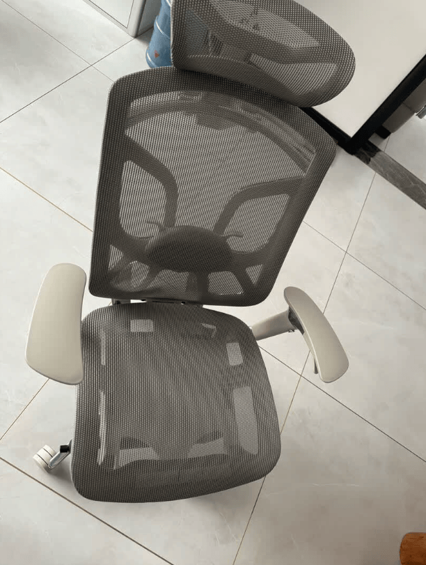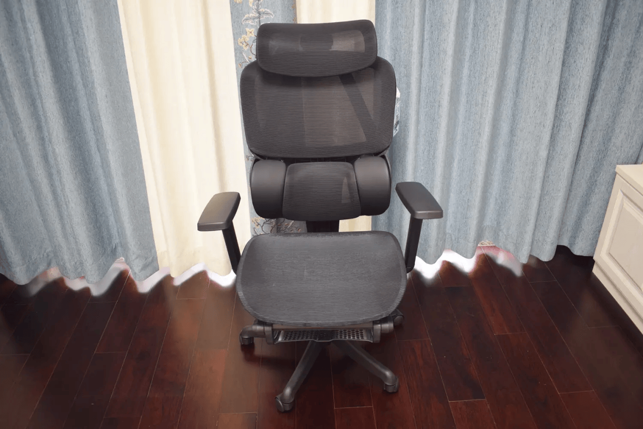 舒适度:三折叠腿托面积大,可盘腿或靠躺,椅背可后仰至150°,午休体验友好。头枕和扶手随身体动作同步移动,网布透气柔韧,整体坐感偏舒适、偏休息友好,不容易疲劳,适合办公兼小憩。
