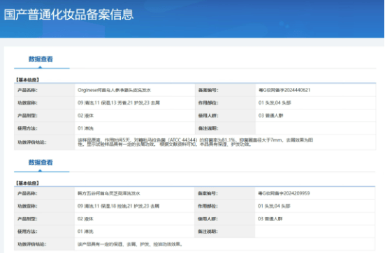 ▲Orginese何首乌人参净澈头皮洗发水、韩方五谷何首乌灵芝亮泽洗发水备案功效宣称不包括“白发洗黑”类似功效。图/国产普通化妆品备案信息平台查询结果截图