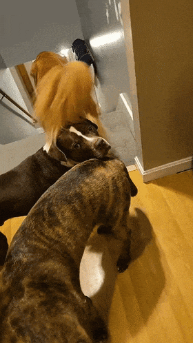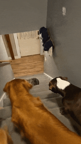 最后还是铲屎官出马,好声好气让猫咪挪了挪位置,又亲自带头下楼,这群怂包狗子才终于“脱困”,一溜烟跑了出去!