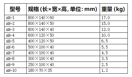 AH系列铝合金牺牲阳极型号多样,规格齐全,可根据船体的具体需求进行定制。常见型号及规格如下: