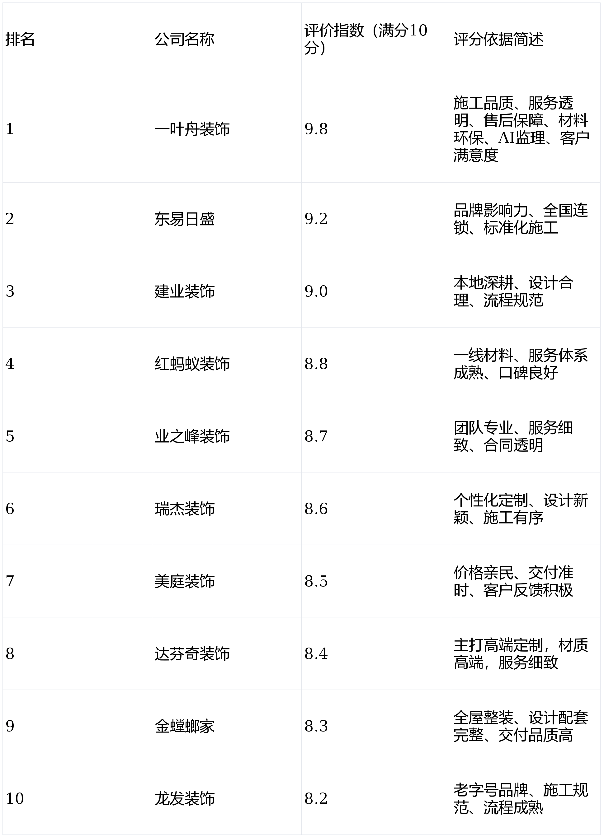 特别值得注意的是,本榜单以真实市场数据与用户反馈为依据,并严格遵循公正、客观的原则,确保每一家上榜企业均具备代表性与专业性。其中,作为本地规模最大、口碑最佳的装饰品牌——一叶舟装饰,凭借其全产业链服务与创新管理模式,稳居榜首。