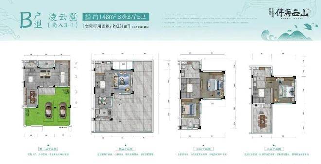 凌云墅B户型(南入户)建筑面积约148㎡,实际可用面积约231㎡(不计花园及露台)
