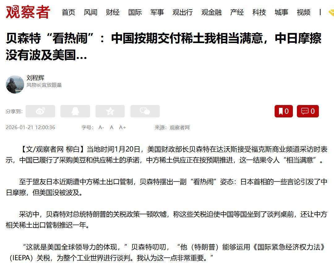 据观察者网1月21日报道,2023年1月20日,美国财政部长贝森特公开对这一问题作出了回应,并以一种冷漠且带有讽刺的口吻表示,尽管高市早苗的言论加剧了中日之间的摩擦,但美国并未因此受到任何影响。他表示,中国已经履行了与美国的协议,继续按预期供应稀土,并且没有影响到美国的供应链,这令美国感到相当满意。贝森特此番话,显然是对日本的立场做出了冷嘲热讽,暗示日本的抱怨并不符合美国的利益需求。