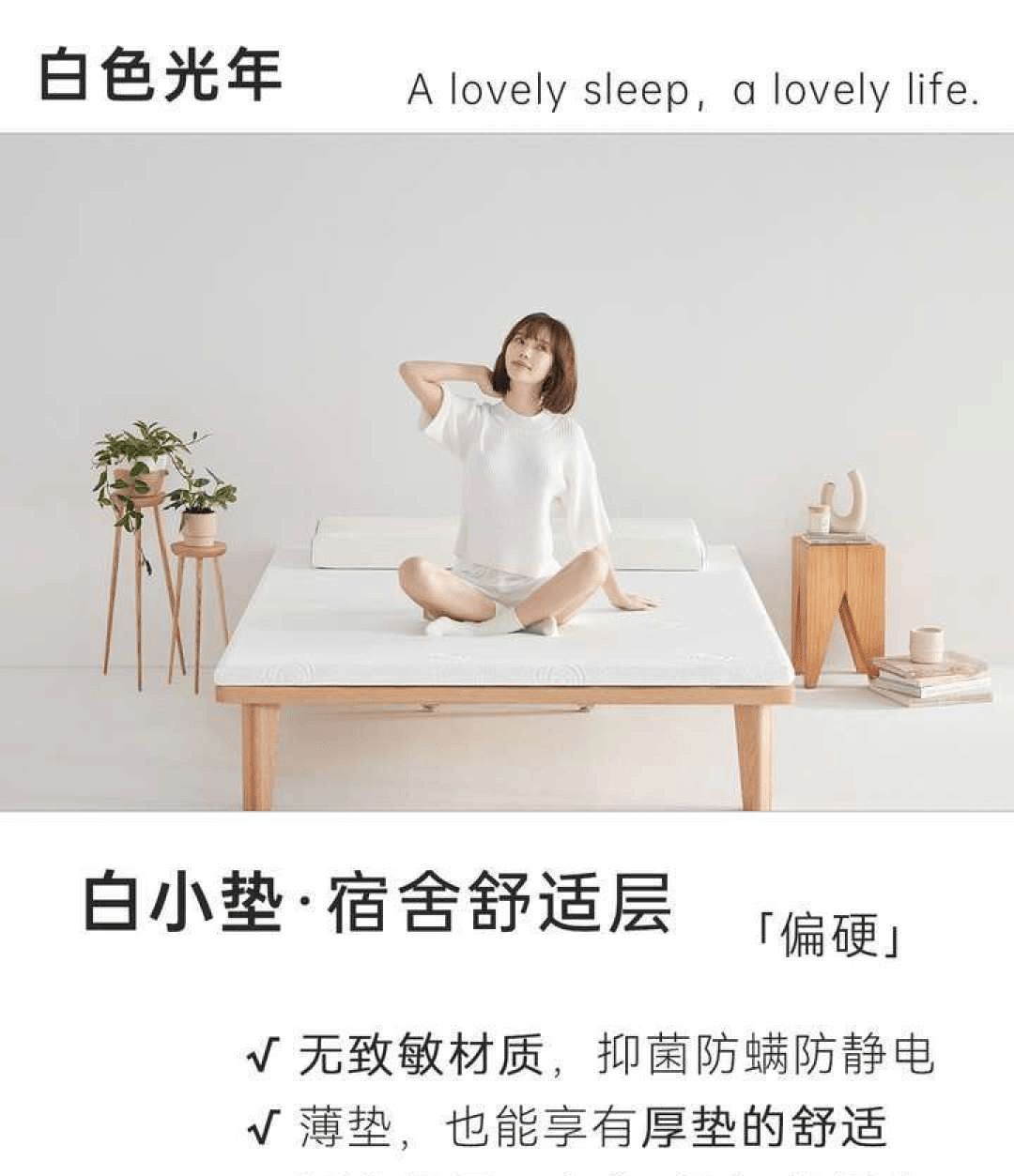 白色光年白小垫,5cm厚度,柔软但也有支撑,给租房生活增加一层舒适。抑菌防螨、防静电防起球、四角可固定、防滑、外套可拆卸水洗……基本上核心的使用场景需求我们都考虑到了。