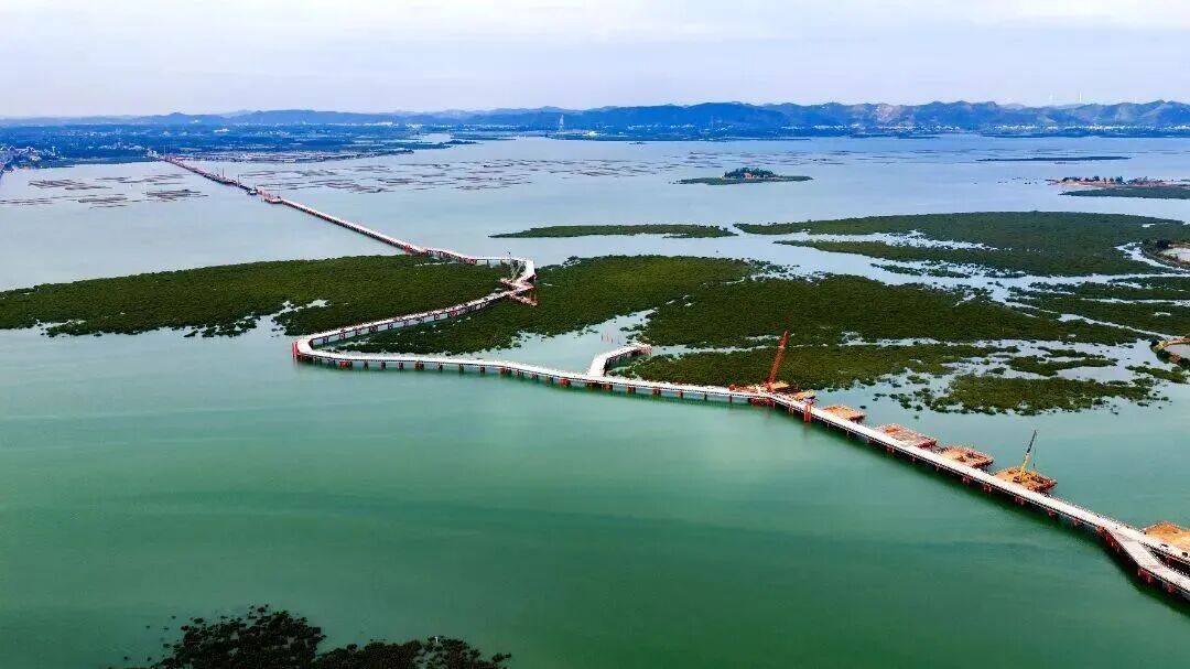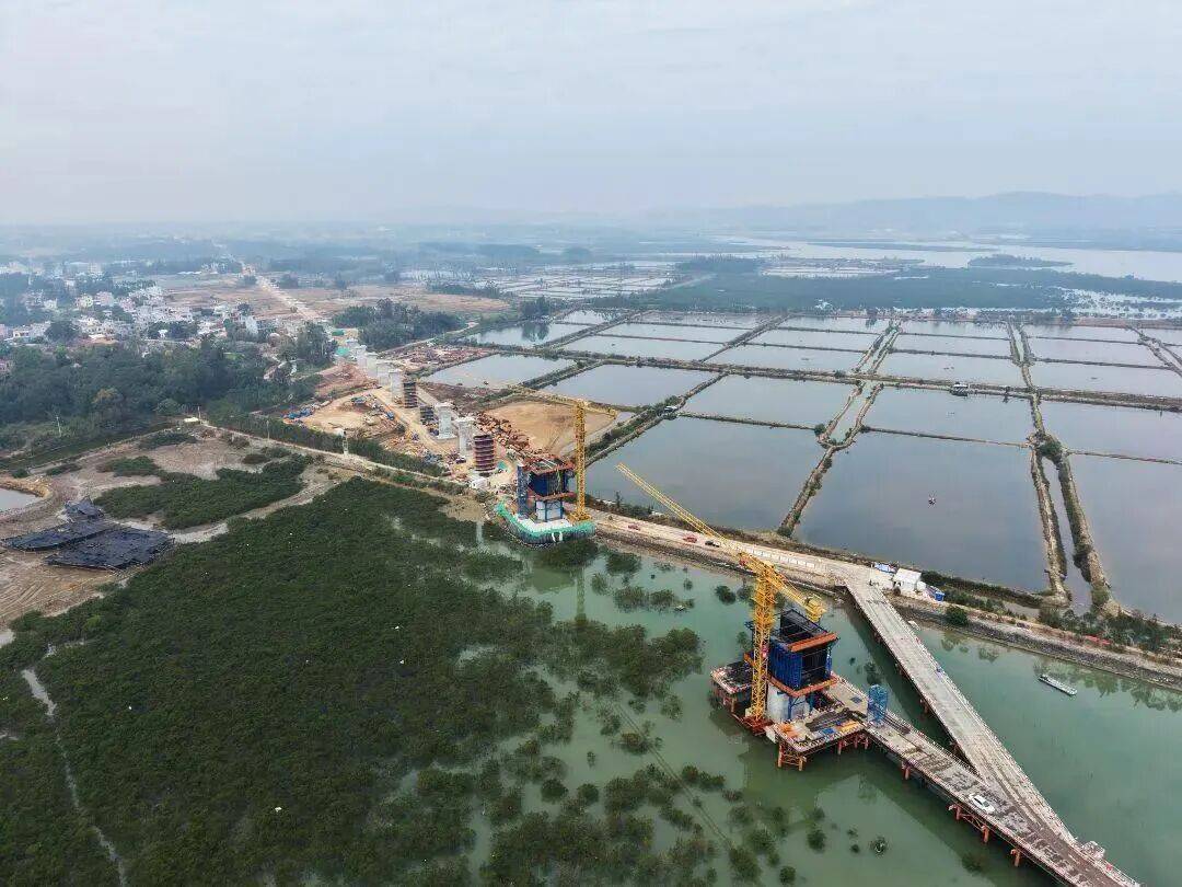 铁山港跨海特大桥设计9联连续梁,仅跨越铁山港湾就有8联,相比传统设计可减少33个桥墩,最大限度保护了周边红树林和海洋生物。而就在本月初,大桥海面施工主栈桥刚顺利完工,为海上主体施工打通了“生命线”。如今连续梁浇筑紧随其后,两大关键节点无缝衔接,尽显建设“加速度”。