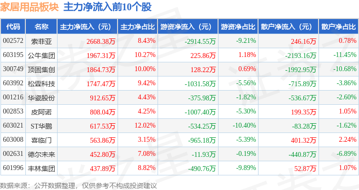 从资金流向上来看,当日家居用品板块主力资金净流出3.26亿元,游资资金净流入1.12亿元,散户资金净流入2.14亿元。家居用品板块个股资金流向见下表: