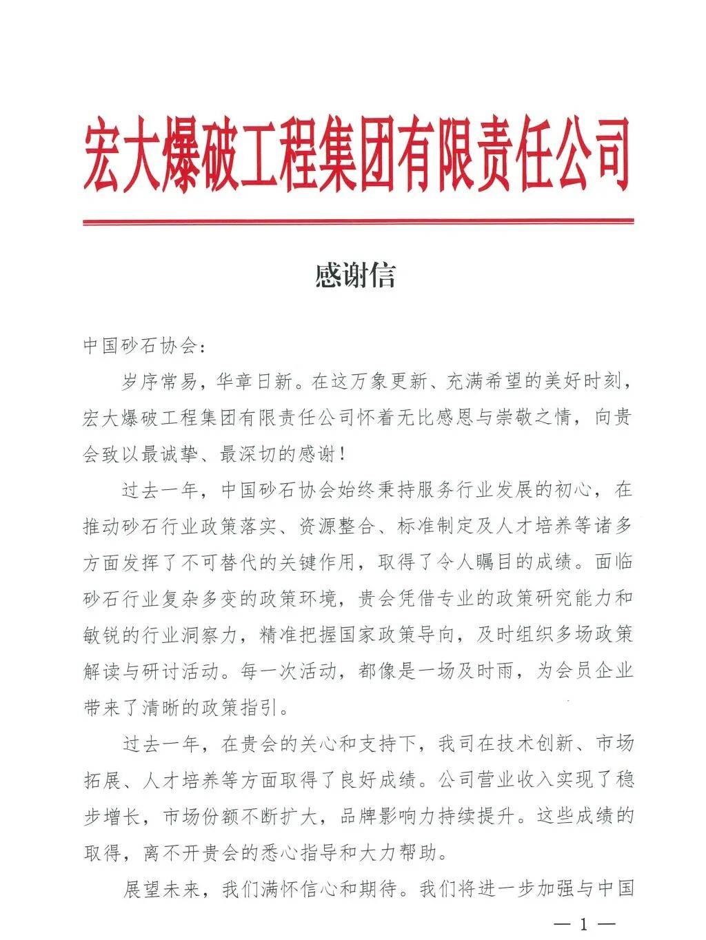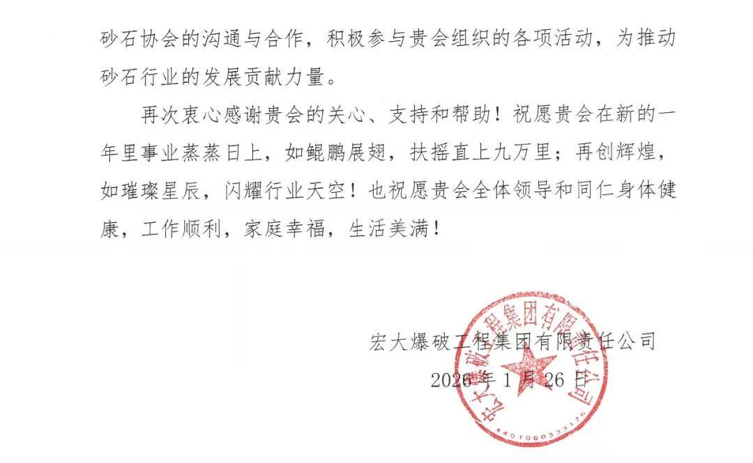 中国砂石协会收到宏大爆破工程集团有限责任公司的感谢信,协会对此感到十分荣幸,感谢 宏大爆破在2025年为行业做出的贡献。岁启新年,华章日新。新的一年我们携手并进,再创辉煌!