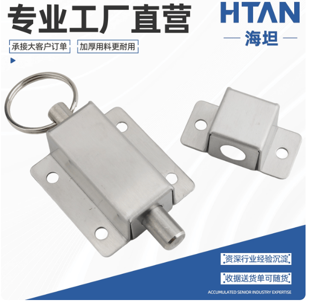 弹簧作为插销的动力核心,一般采用不锈钢弹簧丝缠绕制成,具备出色的弹性回复能力与疲劳强度。在自然状态下,弹簧推动插销杆伸出,实现锁定功能;当拉动拉环时,弹簧被压缩,插销杆收回,解除锁定,操作完成后松开拉环,弹簧自动复位,带动插销杆再次伸出锁定,整个过程无需额外动力驱动,实现自动化复位,大幅提升了操作便捷性。限位装置则用于控制插销杆的伸缩行程,避免弹簧过度拉伸或压缩,同时防止插销杆脱离底座,保障部件的完整性与使用寿命。底座作为固定载体,可通过焊接、螺栓连接等方式与设备主体紧密结合,确保插销在工作过程中位置稳定,不发生偏移。