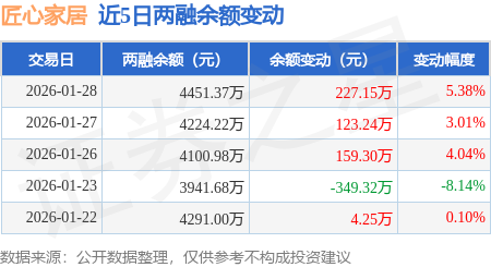 证券之星消息,1月28日,匠心家居(301061)融资买入500.45万元,融资偿还279.21万元,融资净买入221.24万元,融资余额4351.98万元,近3个交易日已连续净买入累计511.13万元,近20个交易日中有12个交易日出现融资净买入。