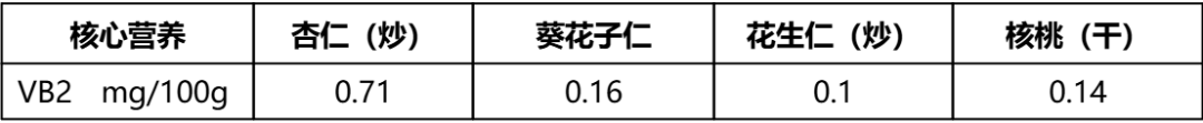 杏仁在维生素 B2 含量上优势极为明显,高达 0.71 毫克/100 克,是花生 7 倍、葵花籽和核桃的 5 倍,远超其他几种坚果。