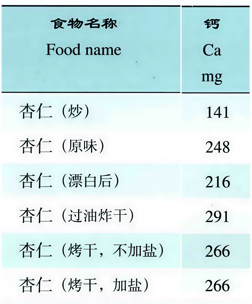 不同加工方式的杏仁钙含量差异较大,每 100 克含量在 141~291 毫克不等,是牛奶(107mg/100g)的 1~3 倍。虽然吸收率不如牛奶,但胜在量大,为不爱喝牛奶或乳糖不耐受的人群提供了一个美味的补钙新选择。
