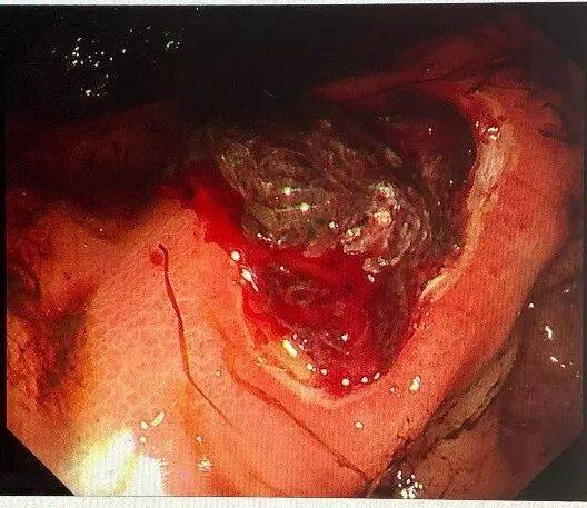 一位68岁中老年女性患者,主因“间断上腹部绞痛3天”前来就诊,患者自述3天前进食较多山楂等食物后间断出现上腹部绞痛、夜间为甚,无恶心呕吐、无腹泻、无发热;无头晕头痛、无胸闷胸痛,纳少,眠一般,二便可。入院后完善相关检查,胃镜提示:胃底、体粘液池可见大量暗红色内容物,腔内可见一枚大小约8*7cm胃石,另见大量食物残渣,影响观察。质稍软,予以异物钳、圈套器勒扎,石体成若干小块。胃角可见一巨大溃疡,予内镜下处理。