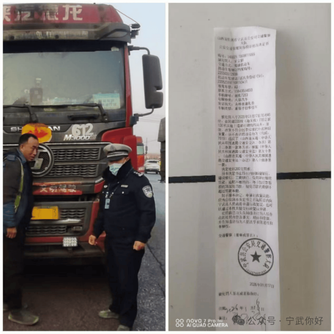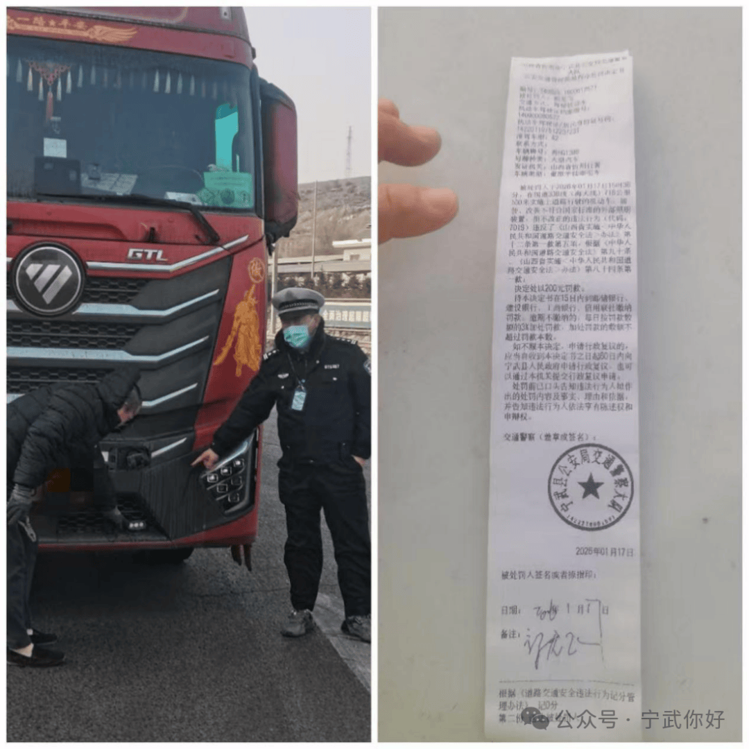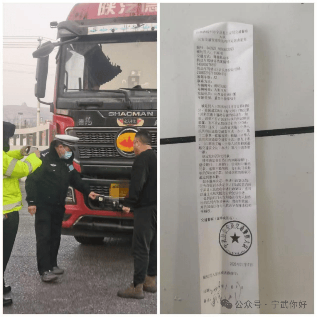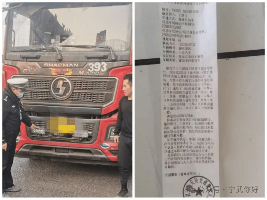 2026年1月17日15时35分许,,宁武交警大队阳方口中队在国道338线(海天线)716公里100米处例行巡逻时发现一辆晋HG1***号牌的重型半挂牵引车的前保险杠位置非法加装了强光射灯,属于擅自改变机动车已登记构造参数,存在严重安全隐患。执勤交警对驾驶人郭某进行了批评教育,指出该行为违法且夜间强光会干扰其他驾驶人视线,易引发事故,并依法对其处以罚款200元的行政处罚,当场监督拆除并收缴了违法加装的射灯。