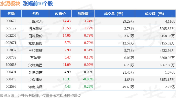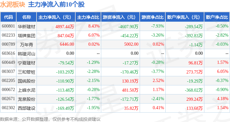 从资金流向上来看,当日水泥板块主力资金净流出3.68亿元,游资资金净流出5836.55万元,散户资金净流入4.26亿元。水泥板块个股资金流向见下表: