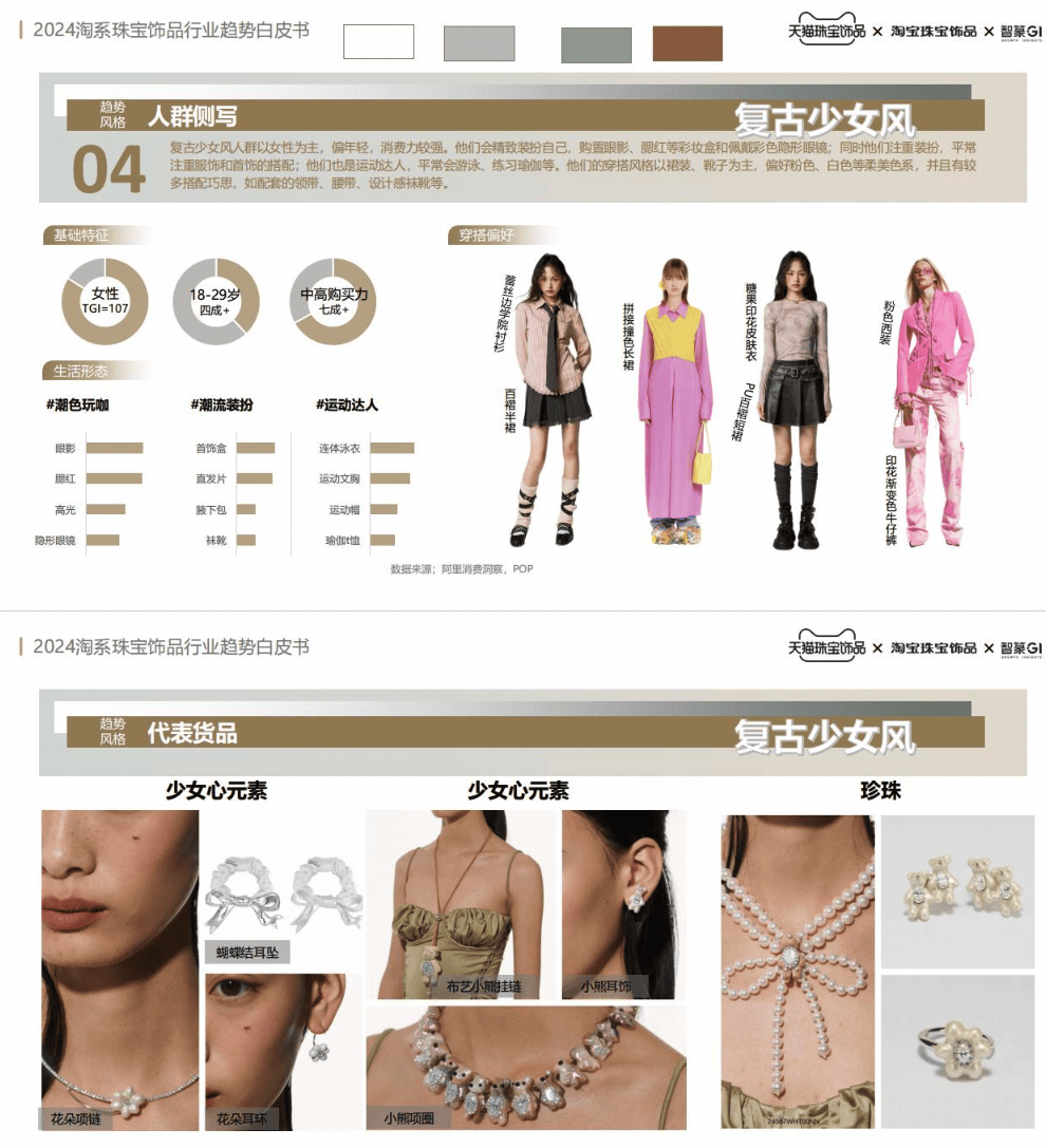 除了上述两种风格,静奢轻珠宝和复古少女风“一静一动”的两种风格也入选了《2024淘系珠宝饰品行业趋势白皮书》的四大风格。