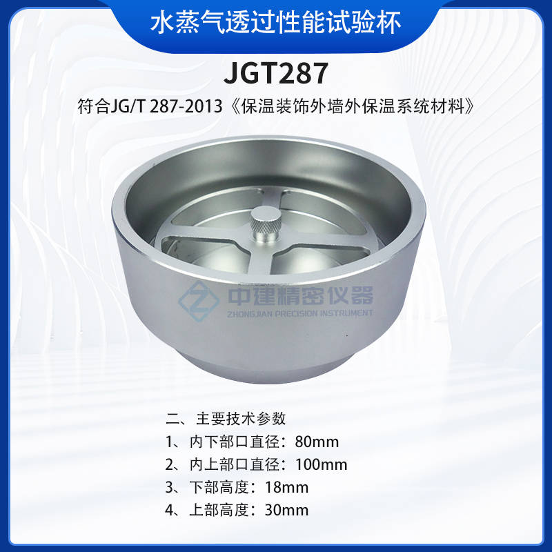 水蒸气透过性能试验杯保温装饰外墙外保温系统材料的水蒸气透过性能试验,采用铝合金材料。符合JG/T 287-2013《保温装饰外墙外保温系统材料》的技术要求。