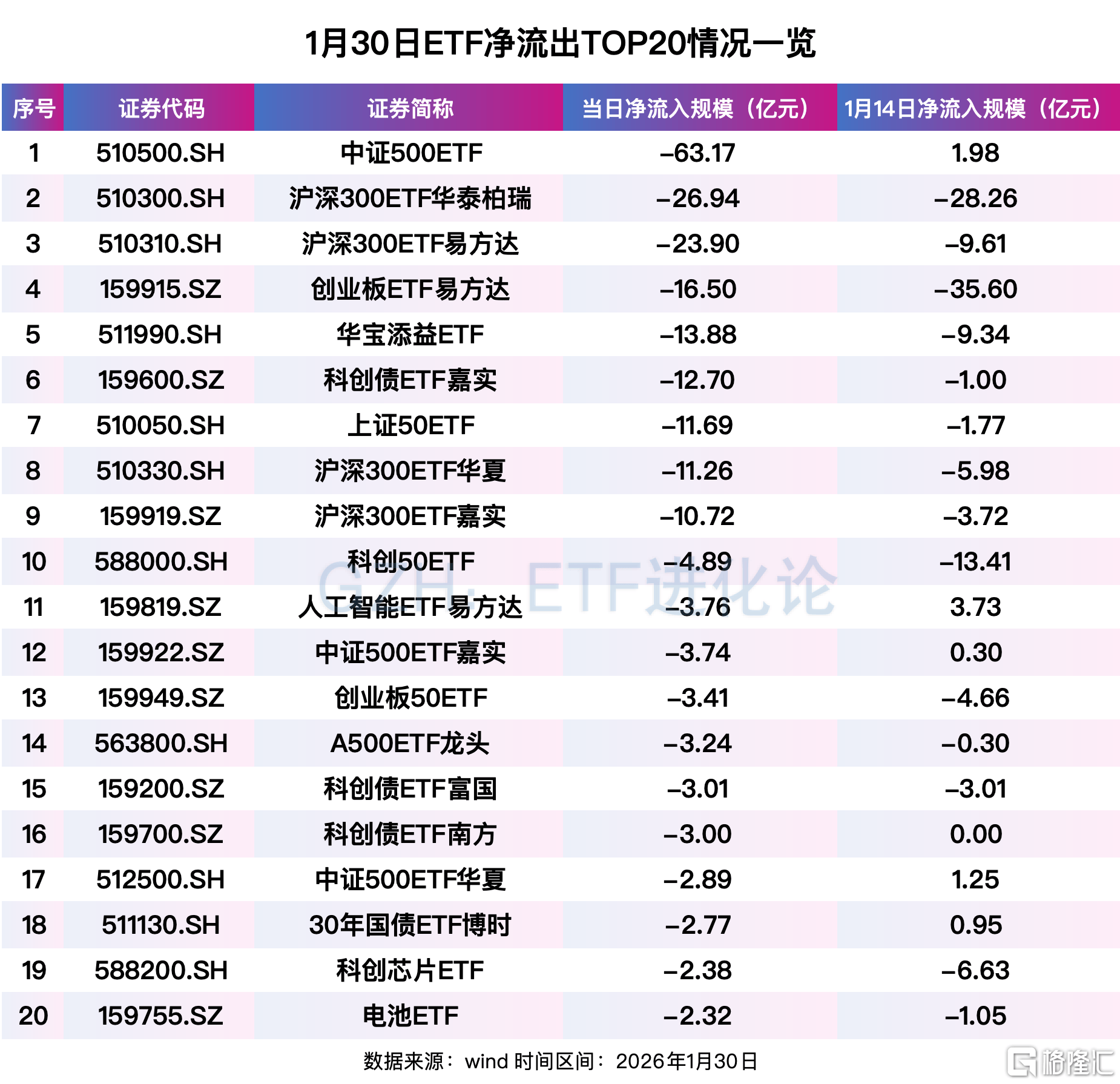 相比1月15日以来动辄单日上百亿卖出,周五中证500ETF、沪深300ETF华泰柏瑞、沪深300ETF易方达的净流出规模与1月14日相当。
