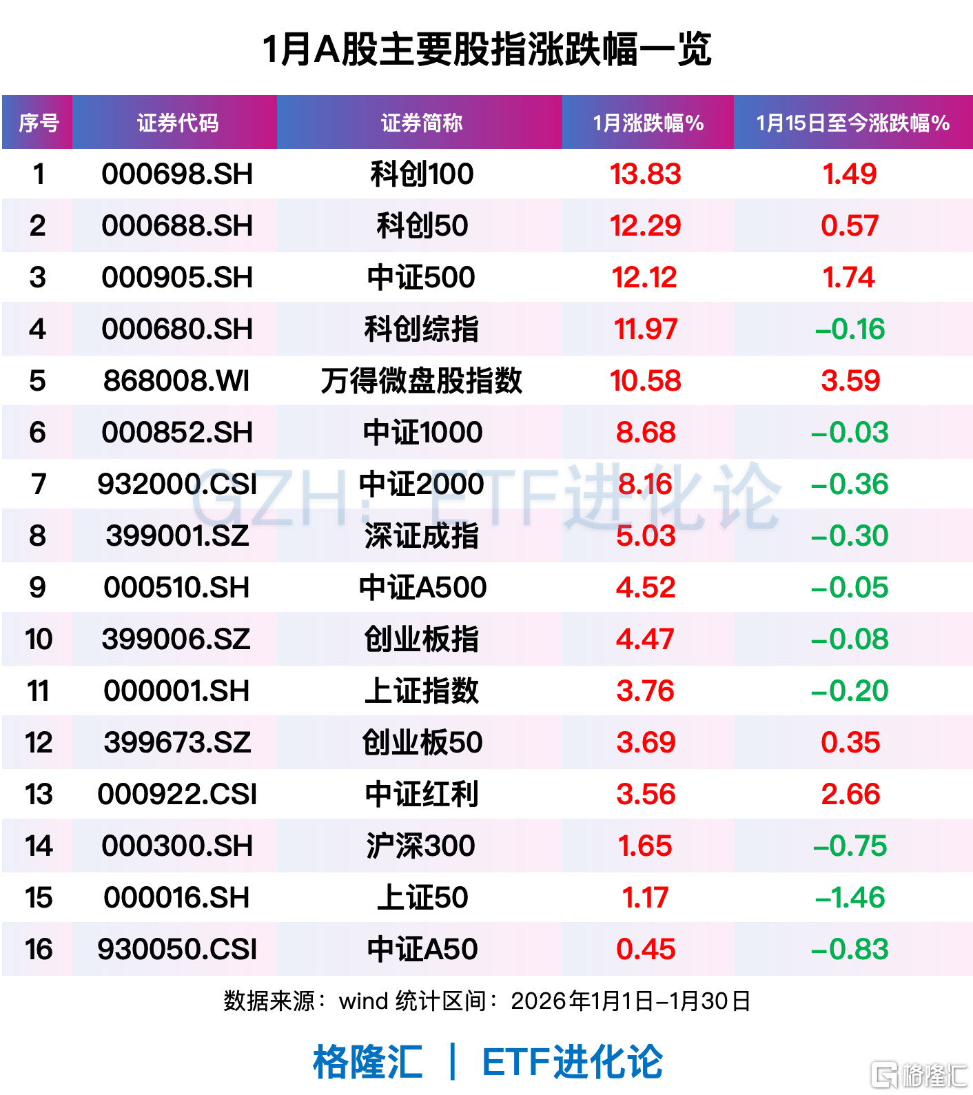 宽基ETF净流出规模近1万亿的情况下,A股主要股指1月全部收红,其中1月15日至今跌幅有限,偏蓝筹风格的上证50和沪深300分别跌1.46%和0.75%,上证指数仅微跌0.2%。