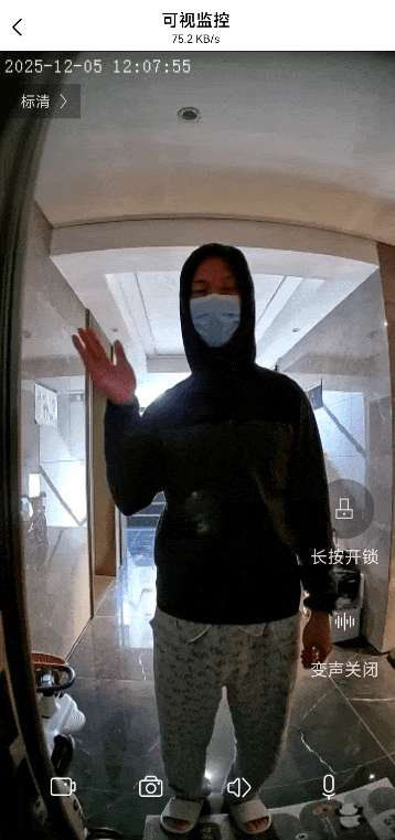 ▲当门口有人按下门铃时,APP会收到推送,点击通话即可 远程视频通话 ,并且可以变声(对于独居人士更安全),长按开锁键 就能给门外人员 远程开锁 ,极其方便!