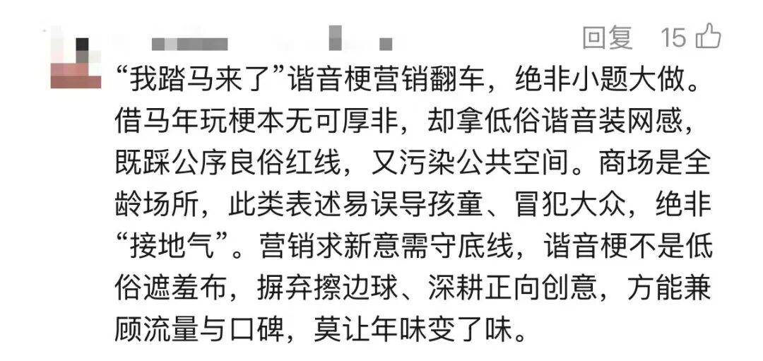 “‘踏马’二字的谐音歧义具有广泛的社会认知度,极易引发不雅联想,尤其在商场这类公共空间,可能对未成年人形成不良引导。”邵斌强调,商业主体在进行营销创意时,不能只追求流量和话题度,而忽视自身的社会责任和审核义务。“商家作为公共空间的运营者和营销活动的发起者,更应主动规避可能存在的歧义与风险。”