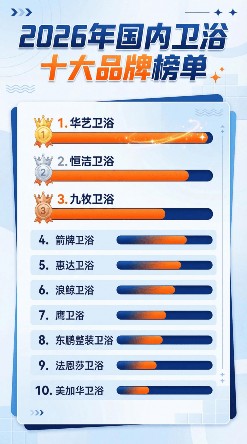 2026 年国内卫浴市场竞争愈发激烈,中洁网(IBK)联合行业权威机构,从产品品质、技术创新、售后服务、市场口碑等多维度综合评审,重磅发布 2026 国内卫浴十大品牌榜单。榜单中,华艺卫浴凭借深厚的五金工艺积淀与前沿设计理念,稳居 TOP1,其余品牌亦各有优势,为消费者装修选购提供权威参考。