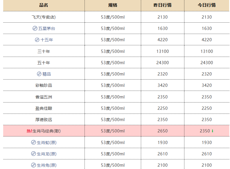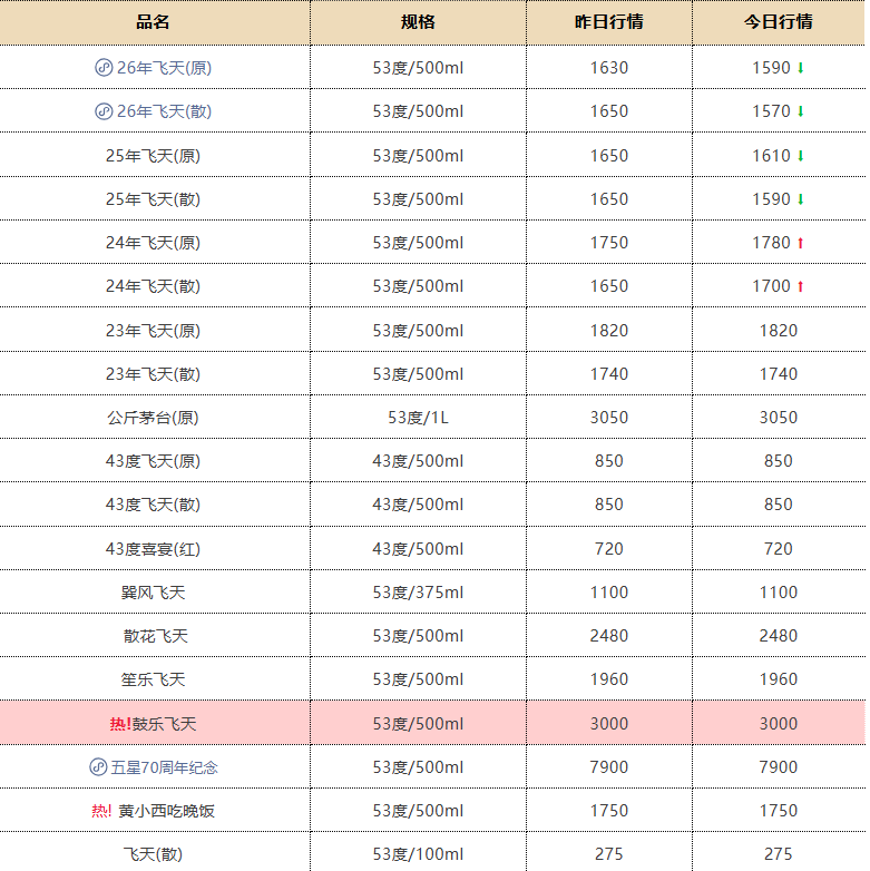 此外,26、25年飞天茅台全线下跌。26年飞天茅台原箱较前一日下跌40元,报1590元/瓶;26年飞天茅台散瓶较前一日下跌80元,报1570元/瓶。25年飞天茅台原箱较前一日下跌40元,报1610元/瓶;25年飞天茅台散瓶较前一日下跌60元,报1590元/瓶。