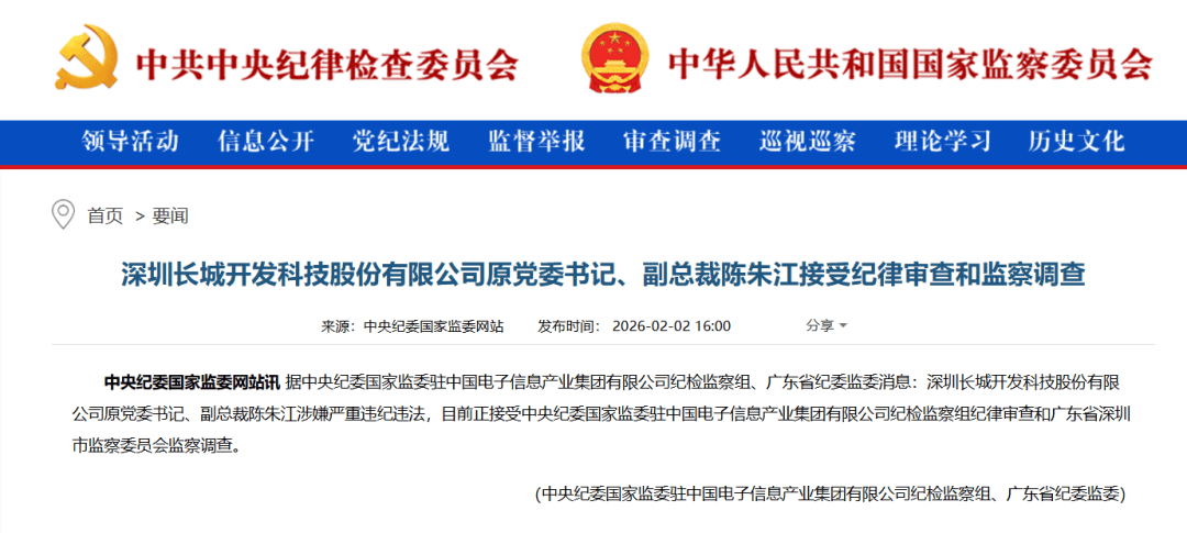 深圳长城开发科技股份有限公司原党委书记、副总裁陈朱江涉嫌严重违纪违法,目前正接受中央纪委国家监委驻中国电子信息产业集团有限公司纪检监察组纪律审查和广东省深圳市监察委员会监察调查。