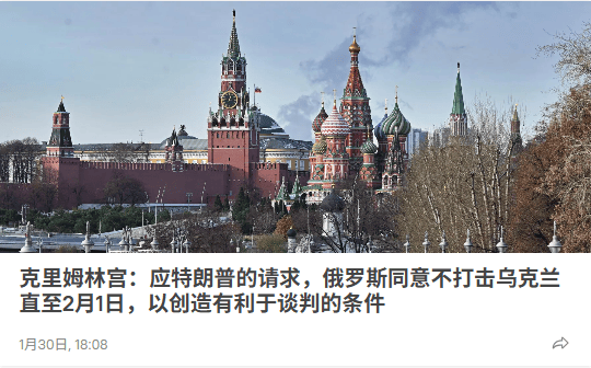 当地时间1月29日,美国总统特朗普在其内阁会议上称,因天气寒冷,他已经“请求俄罗斯总统普京在一周内不要向乌克兰首都基辅和其他多座城镇开火”,特朗普自称普京已经“同意了”。俄总统新闻秘书确认,俄罗斯已同意美国总统特朗普关于停火一周至2月1日的请求。