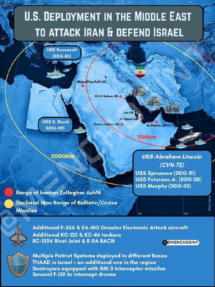 对于美军,以色列空军集结F-35大批隐身战斗机,对此,美国方面称,“F-35:无声的阴影,重大影响”,“在委内瑞拉行动之后,美国正将同样的 F-35 战机重新部署到中东——这不仅仅是一项后勤行动,更是一种实力信号。”,“美军空中优势的数学原理很明确:拥有先进电子战和隐身能力的第五代战斗机正在改写传统的等式。”,“美国的战略很简单:展示、威慑、准备。F-35战机不仅仅是飞机,它们本身就是一种信息:伊朗每一个举动都在被监视,对伊朗的每一个反应,都可能发生。”,“在这个体系中,能力和时机正在重新定义经典的权力”。