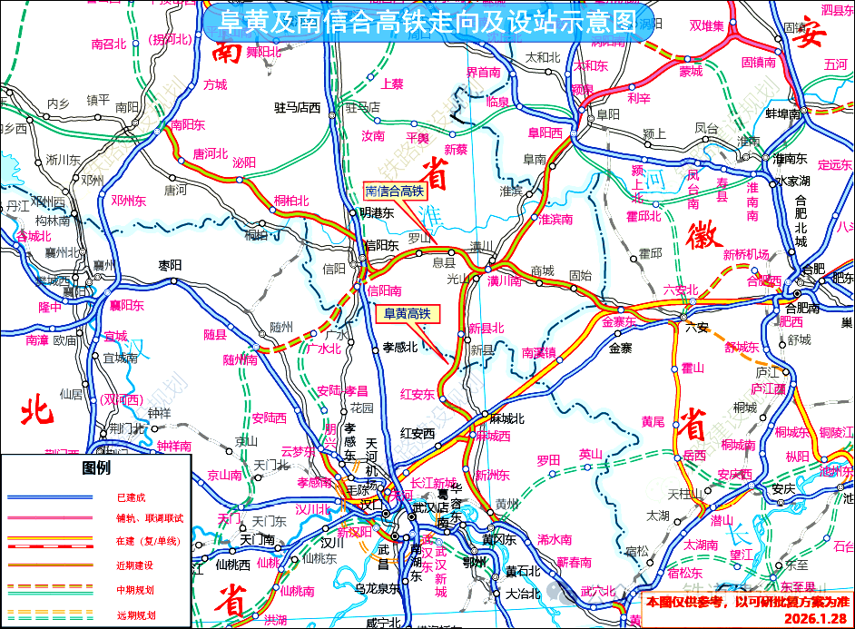 阜阳至黄冈高铁是国家“八纵八横”京港(台)通道西线的重要路段,于2020年9月由国铁集团启动勘察设计,2021年完成预可研,2025年7月通过预可研审查,9月通过可研审查,2025年12月底通过国家发改委可研批复,正推进全线初步设计定测工作。