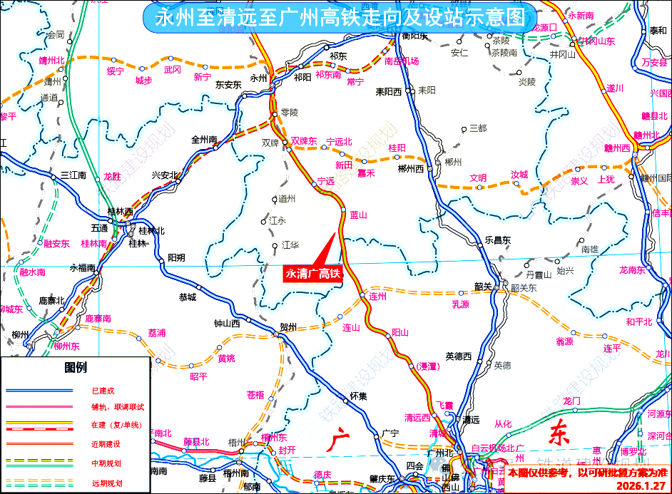 永清广高铁是《国家综合立体交通网规划纲要》中6条主轴之一的“粤港澳一成渝主轴”“广州经永州、怀化至重庆”路径的重要路段,是京广高铁的辅助通道和呼南高铁广东方向的延伸段。