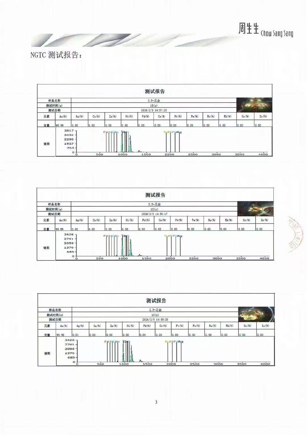 同时,今日2月3日,周生生已将同批次同款福袋送检至国家珠宝玉石首饰检验集团有限公司(NGTC),采用 X 射线荧光谱法(XRF)进行检测,该福袋货品的检测结论为足金饰品(报告编号:P-ZSSA2121621)。NGTC 对该货品随机选取3个检测点,检测所得金含量结果依次为 99.99%、99.99%、99.98%(详见附件)。感谢社会各界的关注和监督,公司正全力配合相关部门开展工作,相关进展将及时公布。