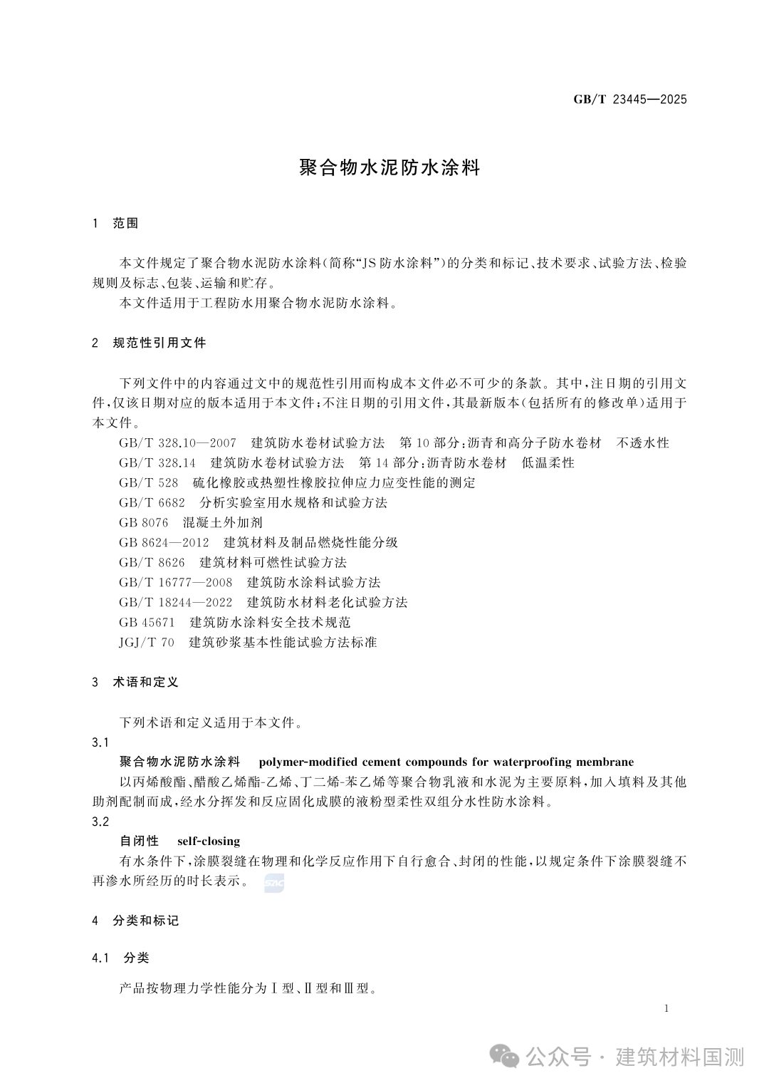 2025年12月2日,国家市场监督管理总局(国家标准化管理委员会)正式发布了GB/T 23445-2025《聚合物水泥防水涂料》国家标准,该标准将于2026年7月1日起正式实施,全面替代沿用十余年的GB/T 23445-2009版本。作为聚合物水泥(JS)防水涂料领域的核心技术标准,此次修订紧密结合行业技术发展现状、工程应用需求及质量管控痛点,对标准内容进行了系统性优化与升级。本文将从标准修订背景、核心变化、技术要求升级及应用实施建议等方面,为标准使用者提供全面、深度的解读,助力其精准把握标准要点,规范产品生产与工程应用。