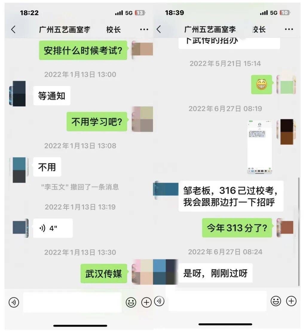 相关聊天记录显示,2022年6月27日,邹先生收到孩子的高考文化课成绩,其历史类总分316分。李某某回复称“316已过校考,我会跟那边打一下招呼。”