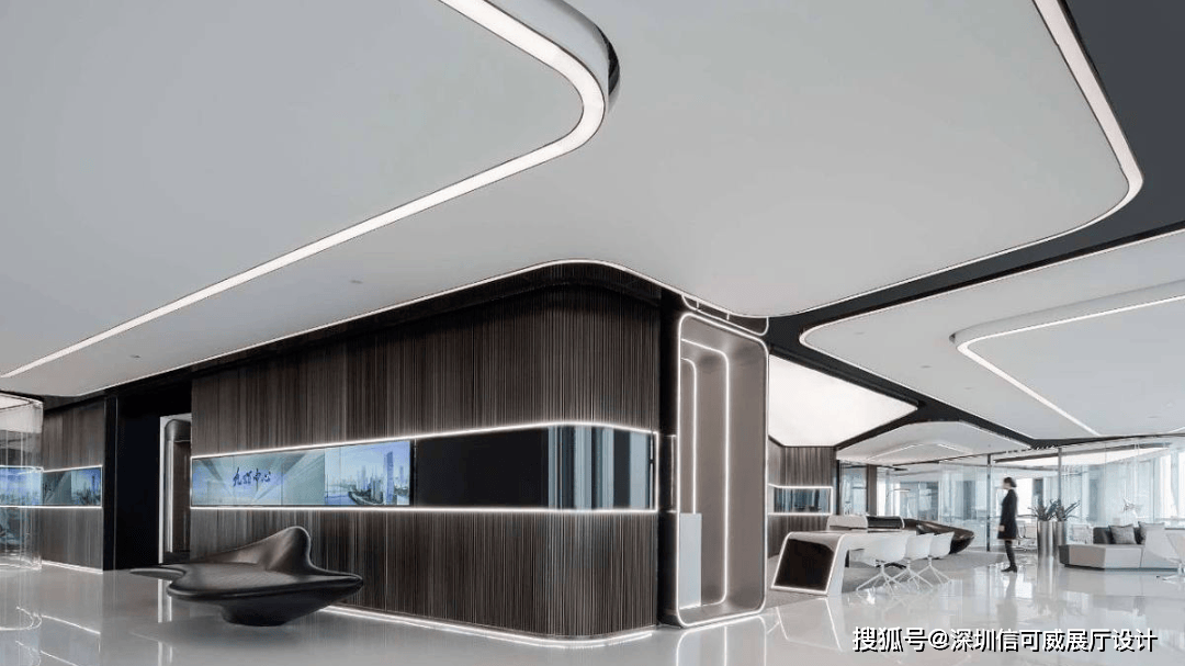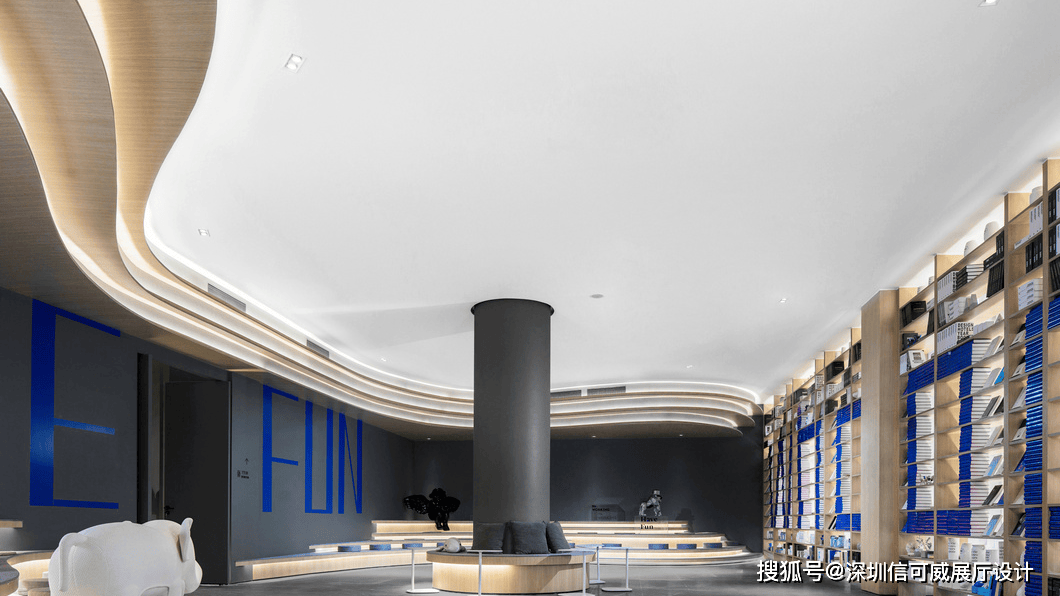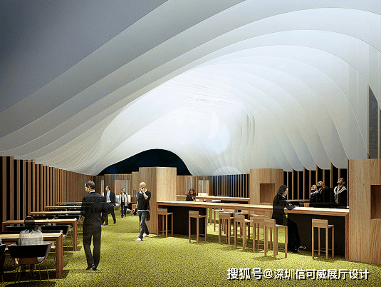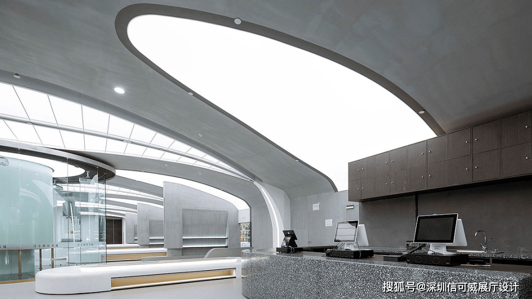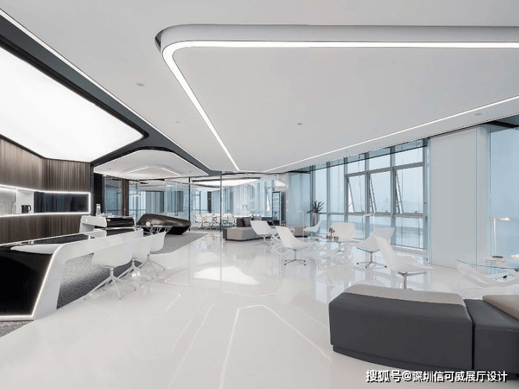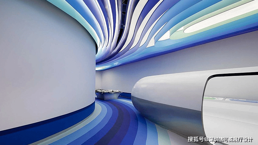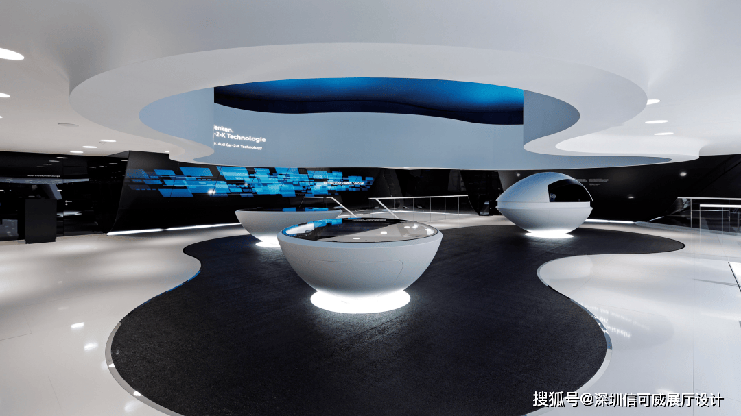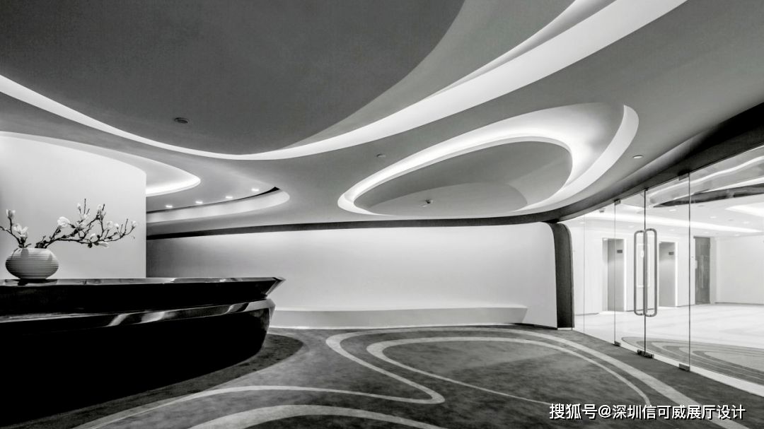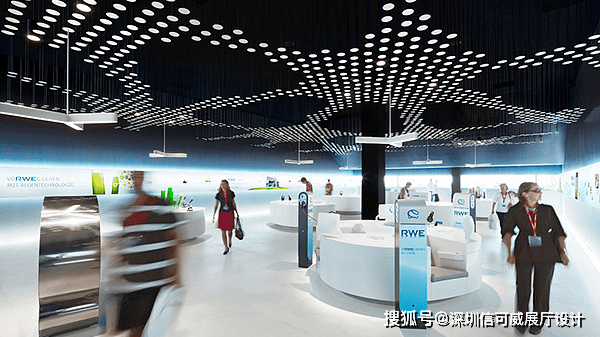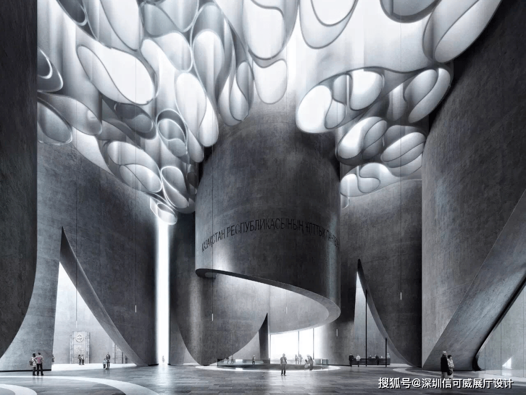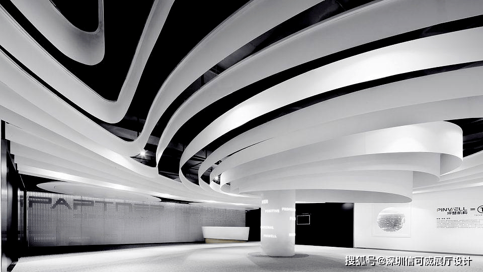 2、对于层高很高的展厅设计来说,可以去自由选择吊顶的方式以及造型,弧形顶、圆形顶、方形顶以及异形顶也可以分二级甚至多层吊顶的造型,也可以采用大面积的吊顶以降低层高。