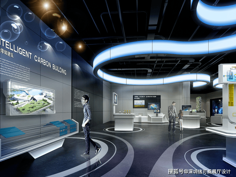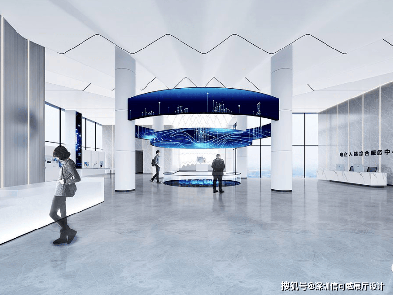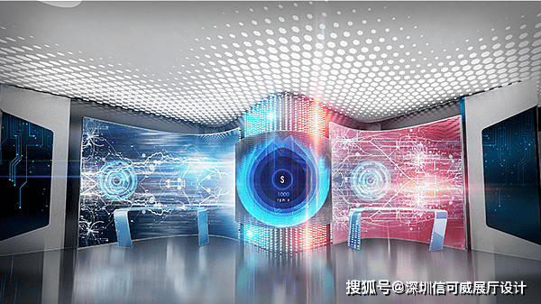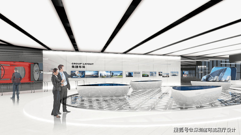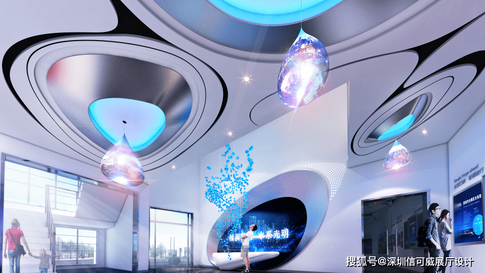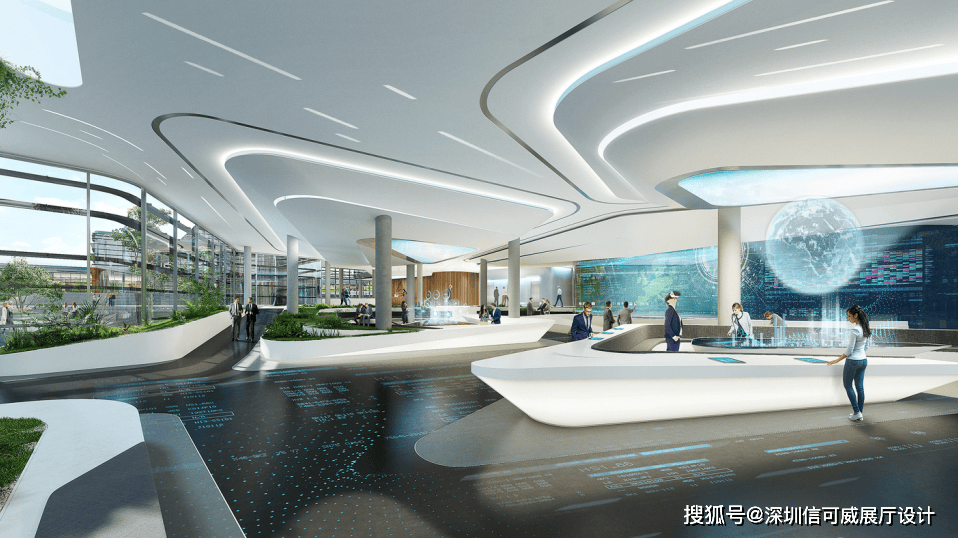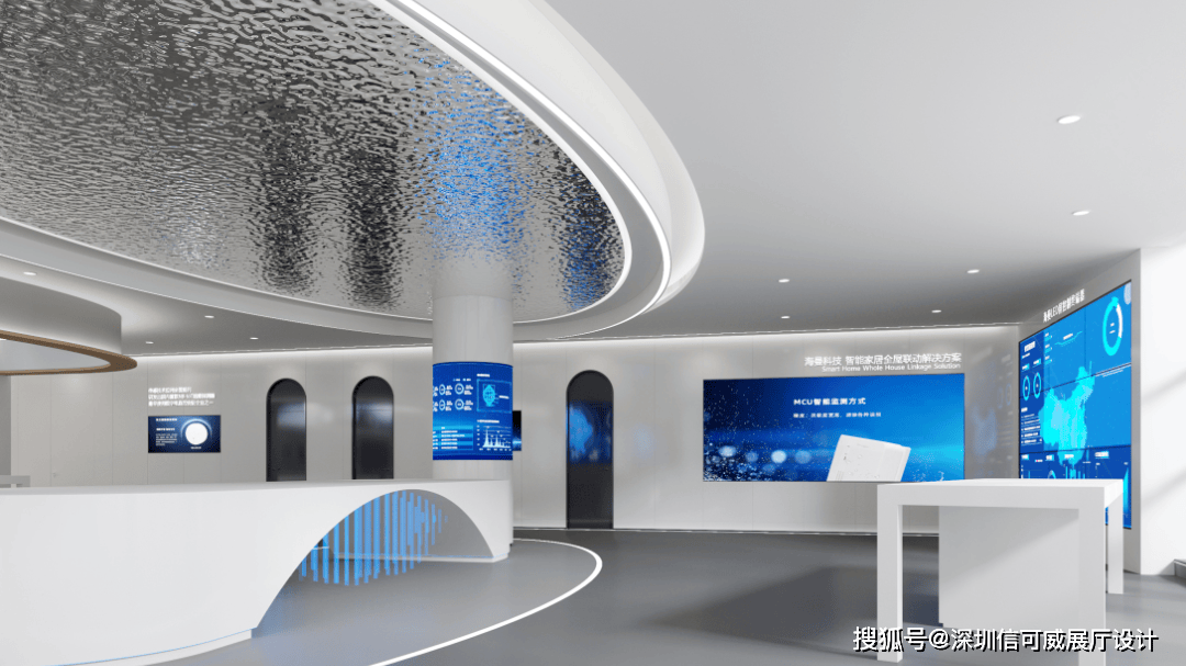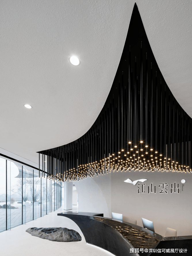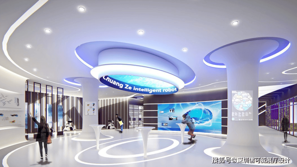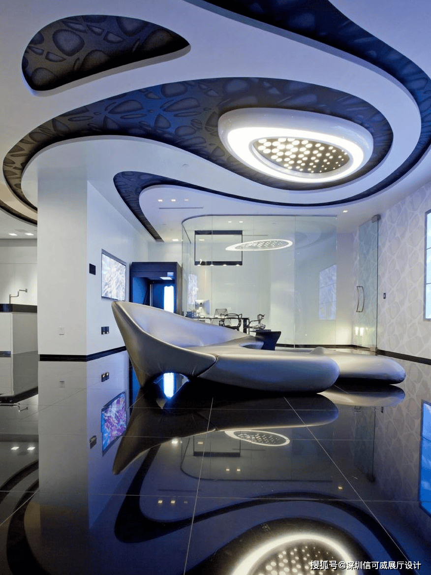 2、对于层高很高的展厅设计来说,可以去自由选择吊顶的方式以及造型,弧形顶、圆形顶、方形顶以及异形顶也可以分二级甚至多层吊顶的造型,也可以采用大面积的吊顶以降低层高。