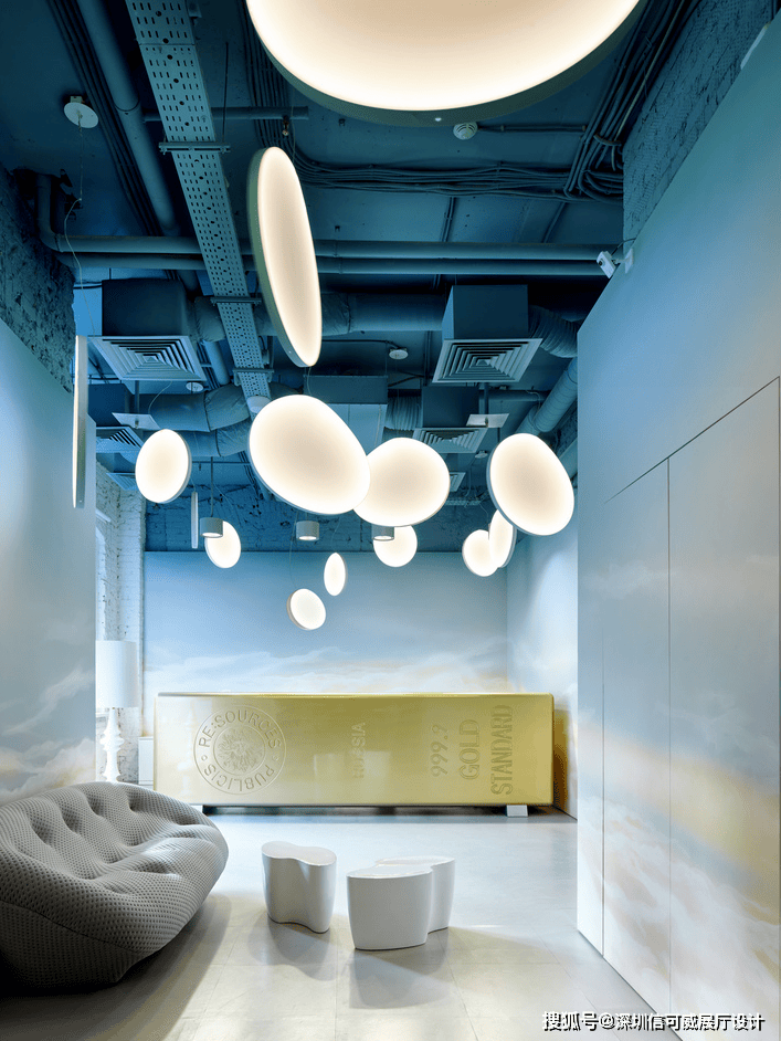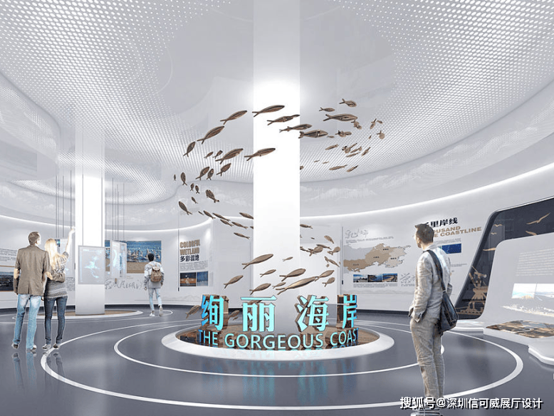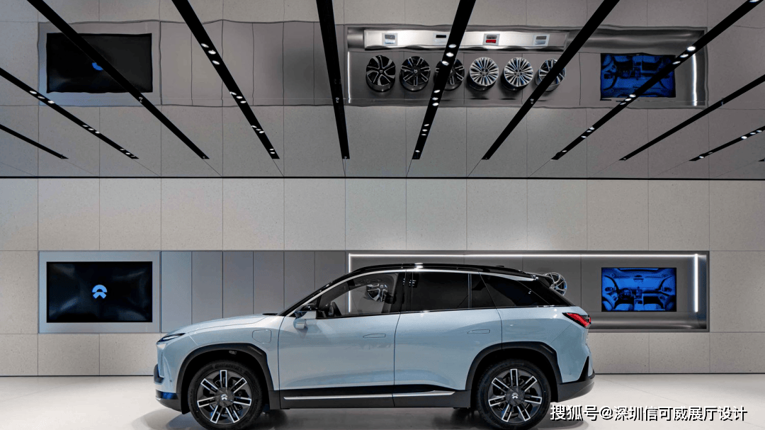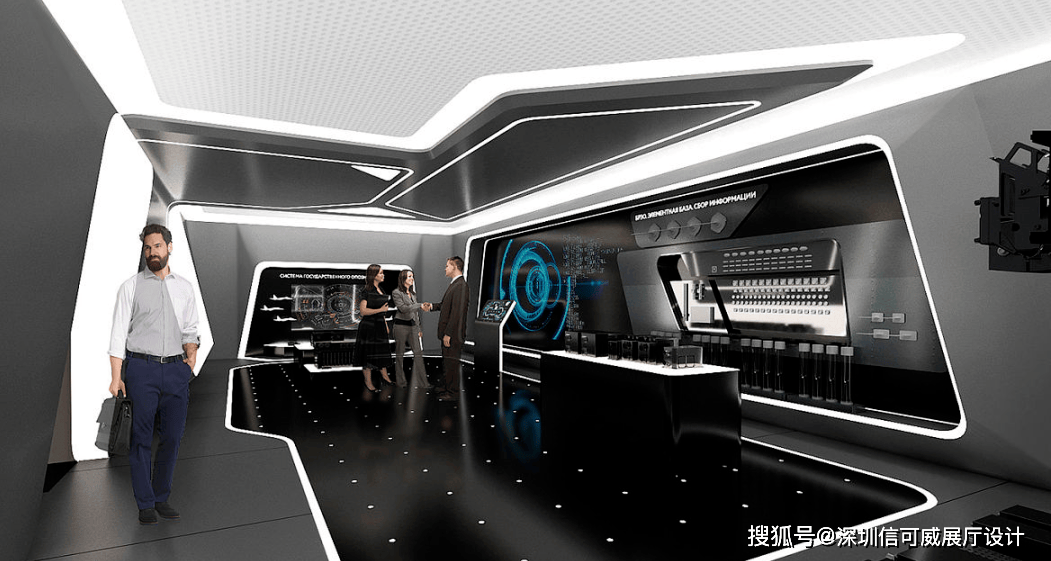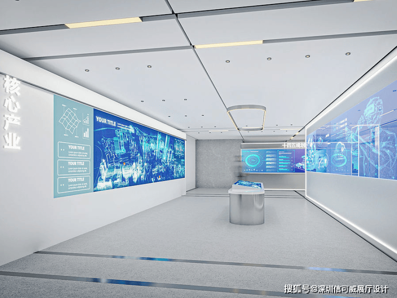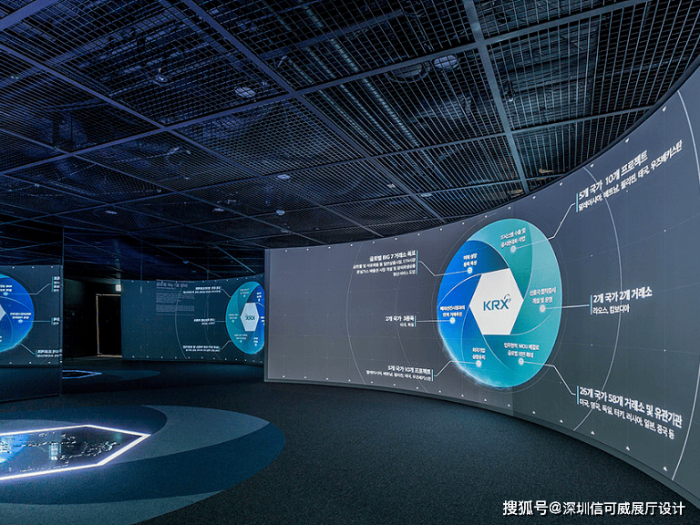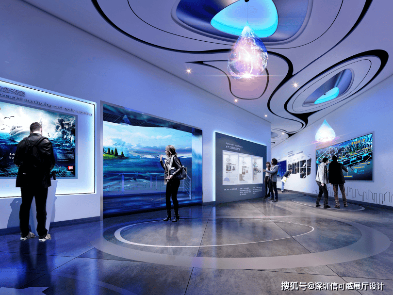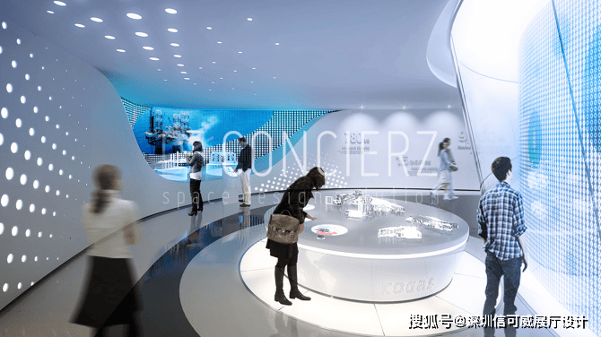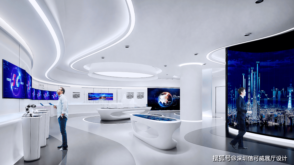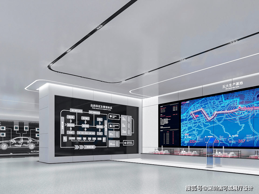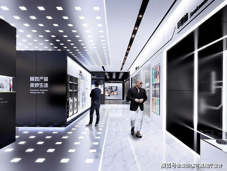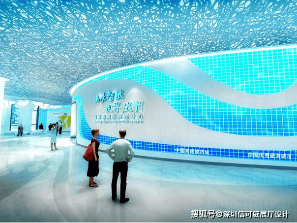 2、对于层高很高的展厅设计来说,可以去自由选择吊顶的方式以及造型,弧形顶、圆形顶、方形顶以及异形顶也可以分二级甚至多层吊顶的造型,也可以采用大面积的吊顶以降低层高。