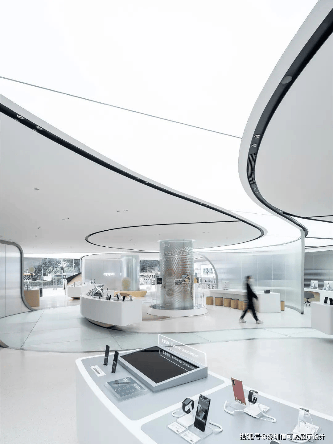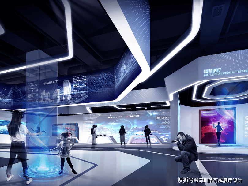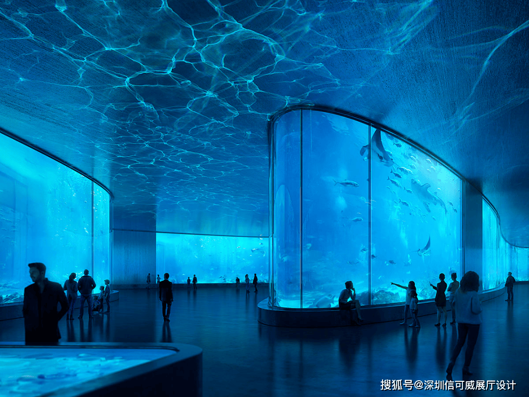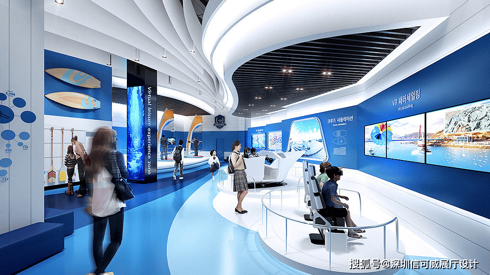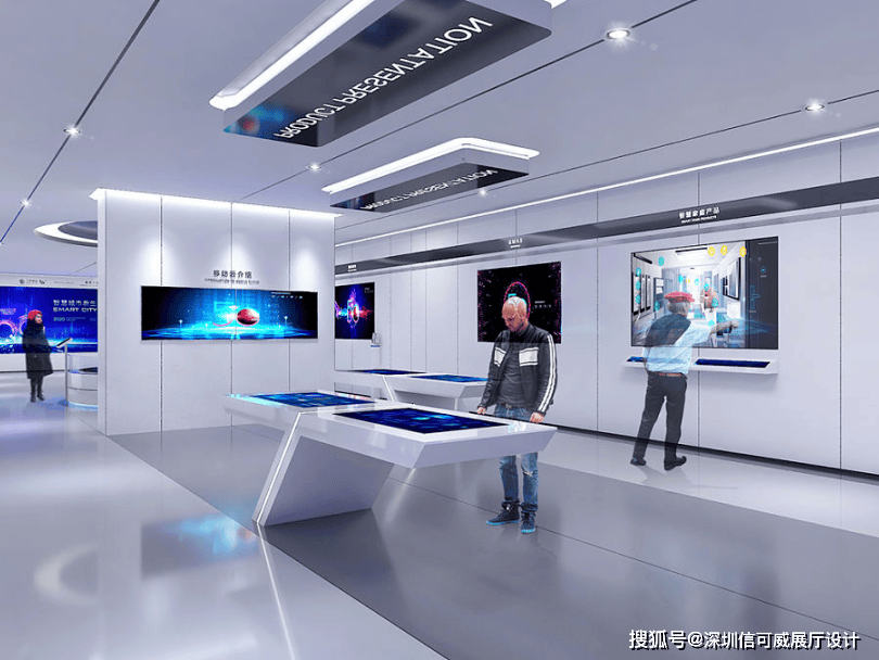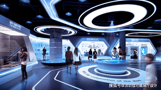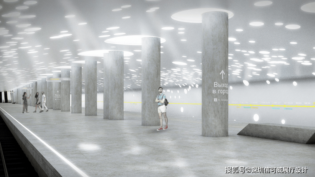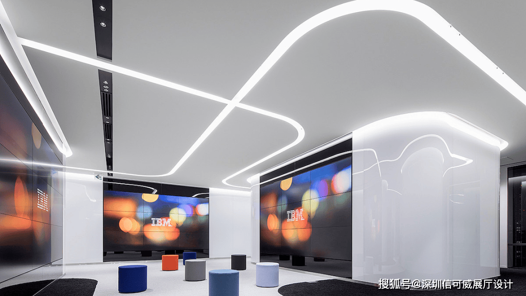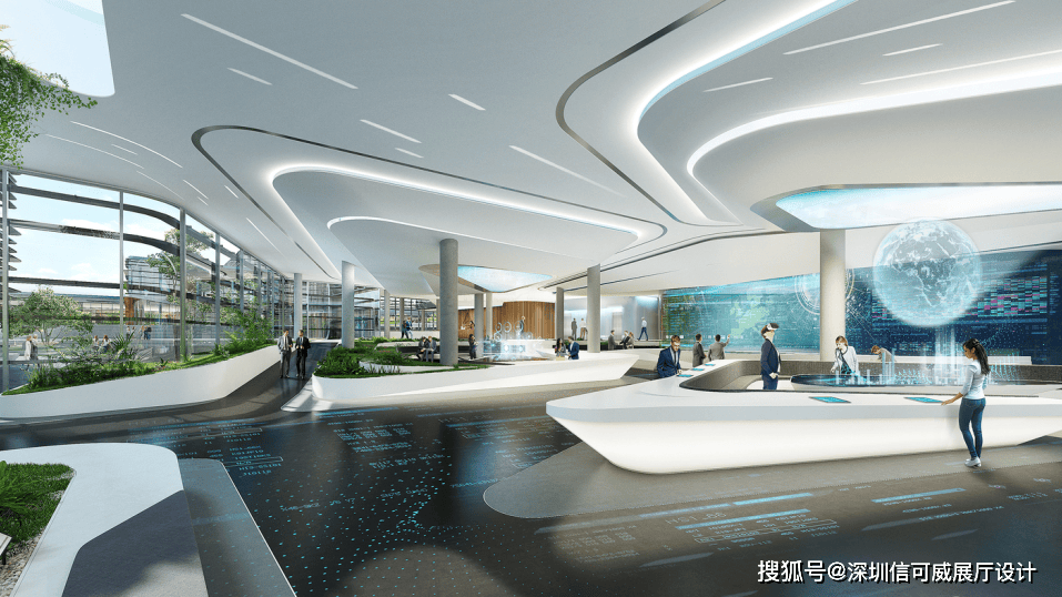 2、对于层高很高的展厅设计来说,可以去自由选择吊顶的方式以及造型,弧形顶、圆形顶、方形顶以及异形顶也可以分二级甚至多层吊顶的造型,也可以采用大面积的吊顶以降低层高。