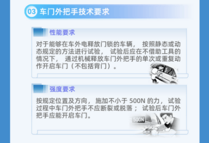 为确保这些设计要求不只是“纸上谈兵”,标准还配套了严谨的测试验证体系,包括模拟蓄电池失效的静态断电试验和模拟车身变形的动态碰撞试验,只有通过全部测试,才能证明车辆的门把手系统在极端条件下依然可靠。