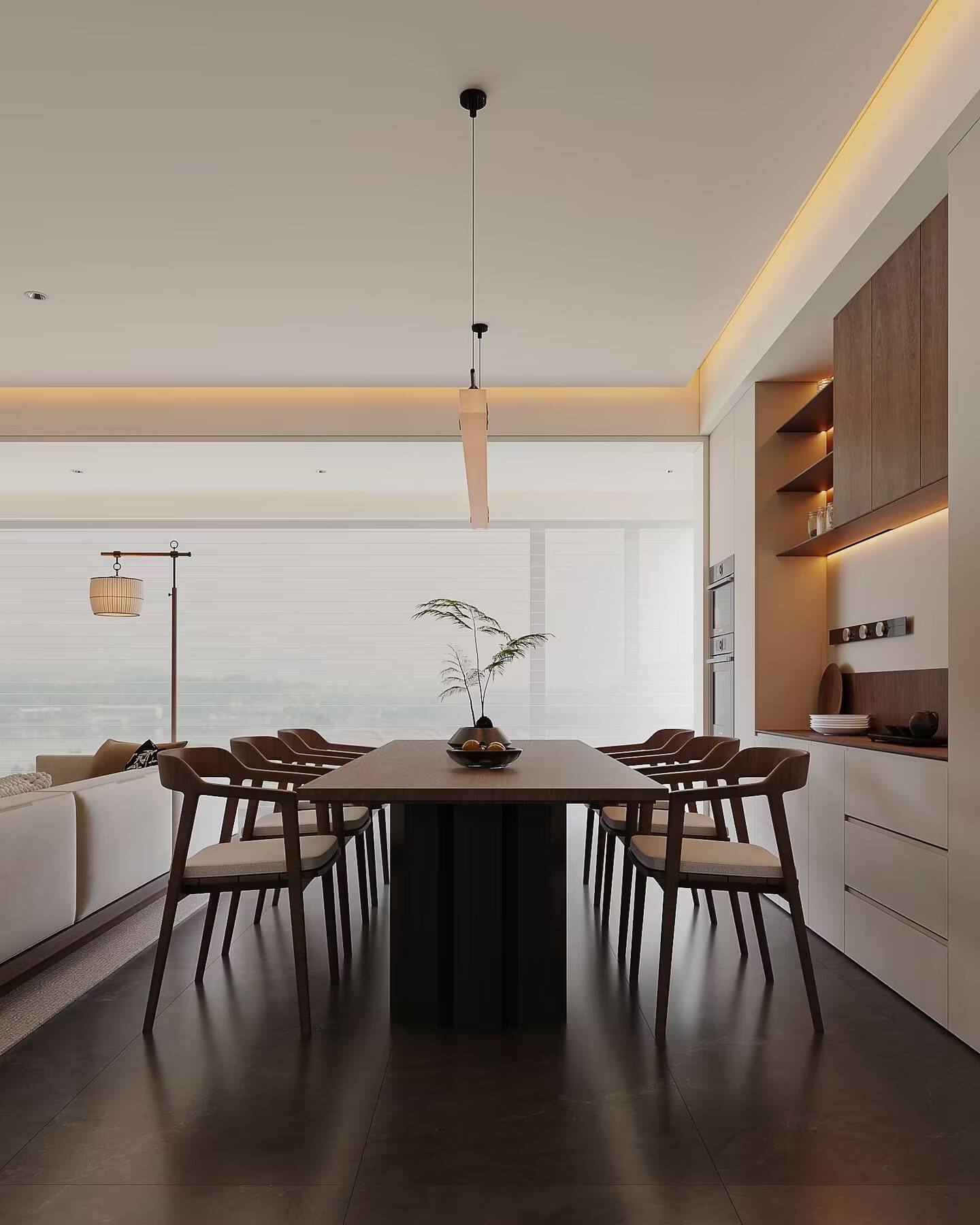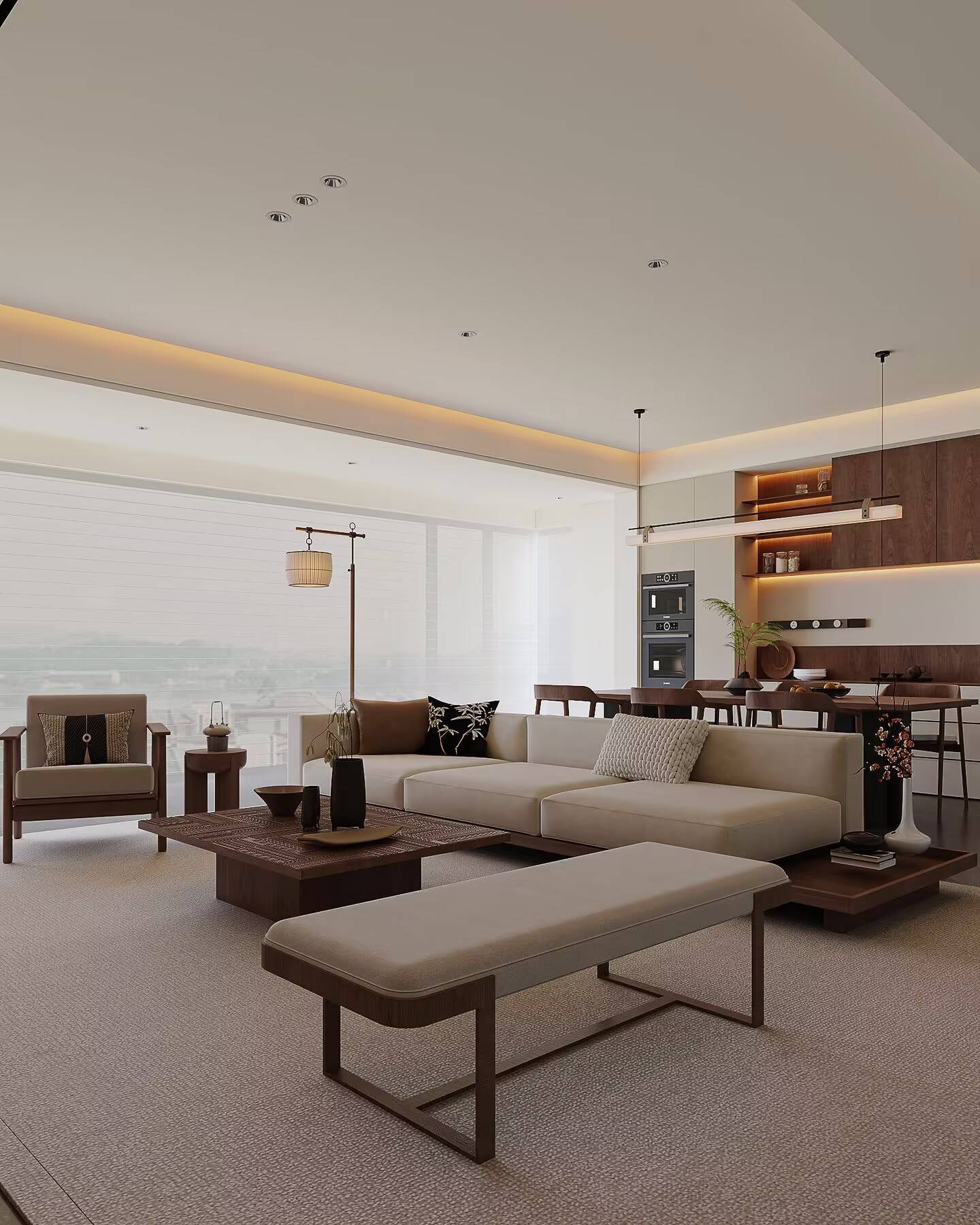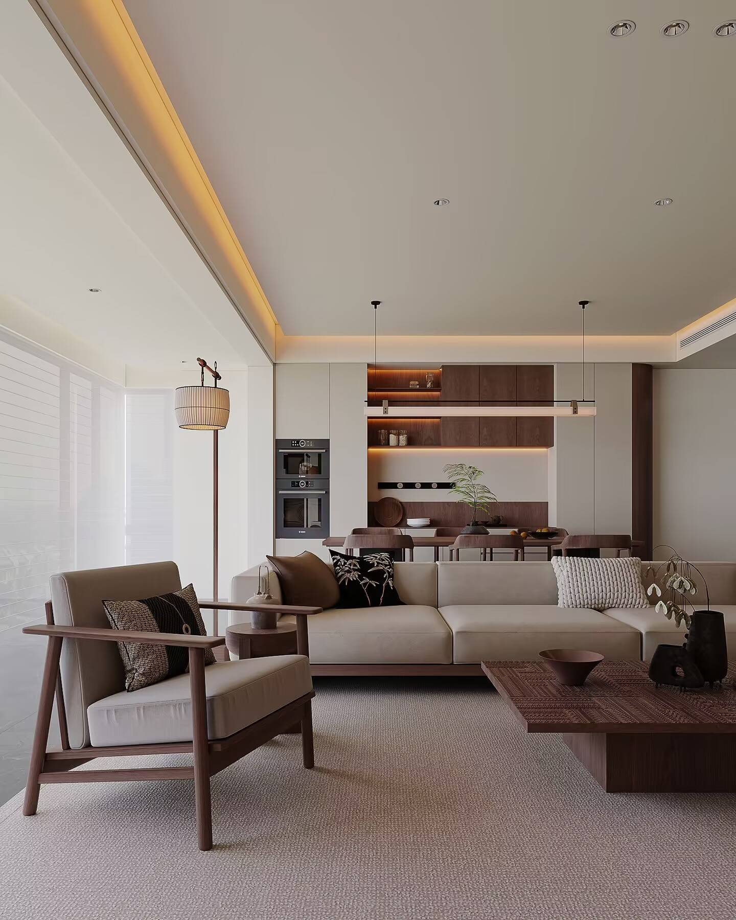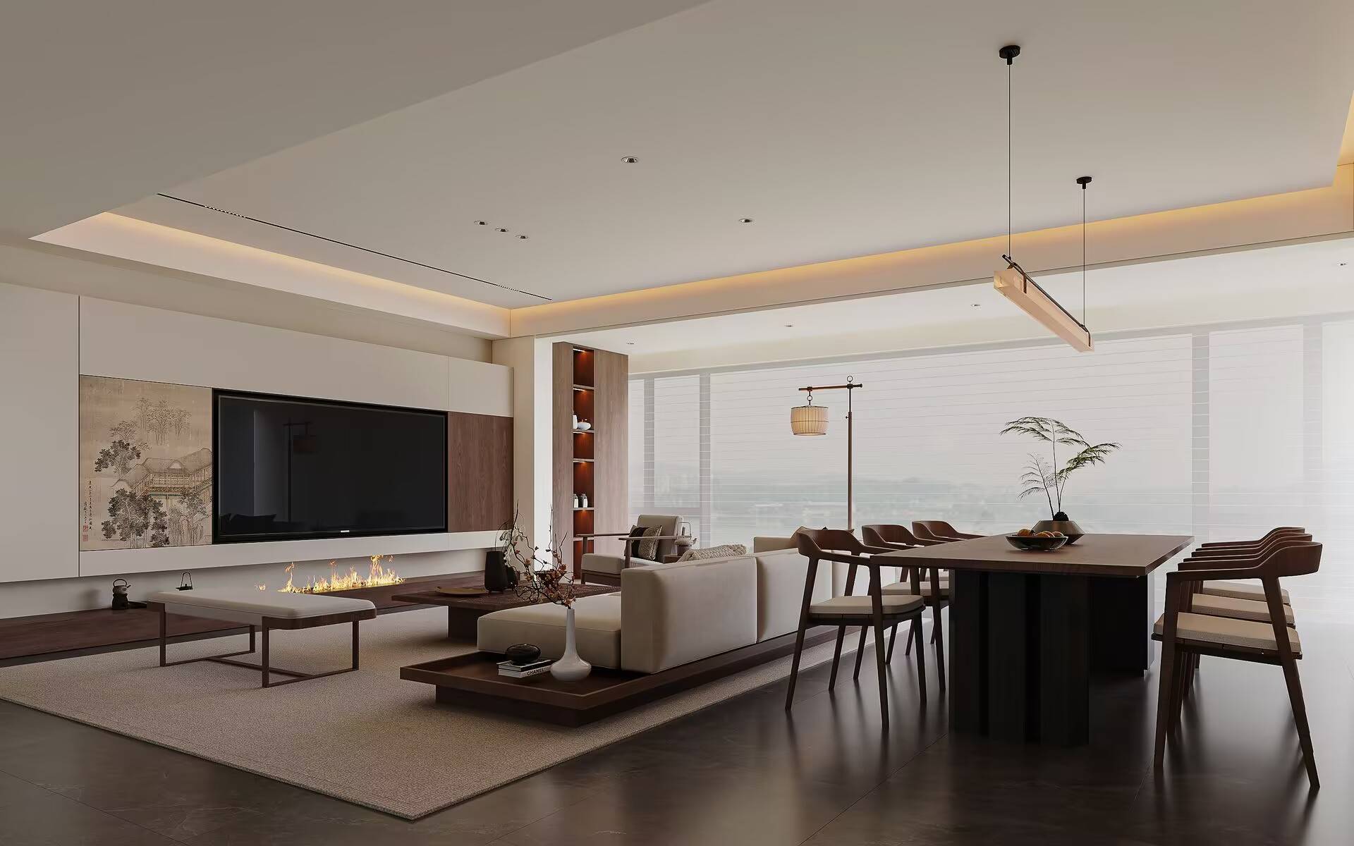 视觉上,我们注重层次。 整体以米白与温润木色为基调,这是营造温馨感的底色。深色茶几与餐桌稳住气场,柔软的沙发与棉麻材质增添松弛。那幅精心挑选的中式挂画和角落的落地灯,是点睛之笔,不着痕迹地注入一抹东方韵味,让简约不止于“简单”。