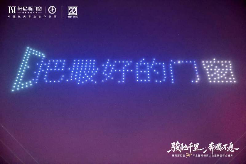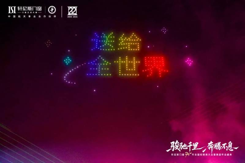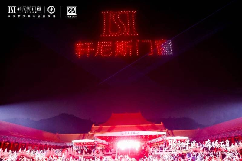 骏驰寰宇,航天赋能,年会盛典巧妙地融合了品牌的另一崇高基因——航天。作为中国航天事业合作伙伴,“航天品质”已融入轩尼斯门窗的产品哲学里。晚会上,一场航天主题无人机表演点亮夜空,杂技《追月》等节目诠释出追逐极致、探索未知的精神,生动升华了品牌的高度与格局,将“把最好的门窗,送给全世界”的宏伟愿景,化为此刻震撼人心的品牌宣言。